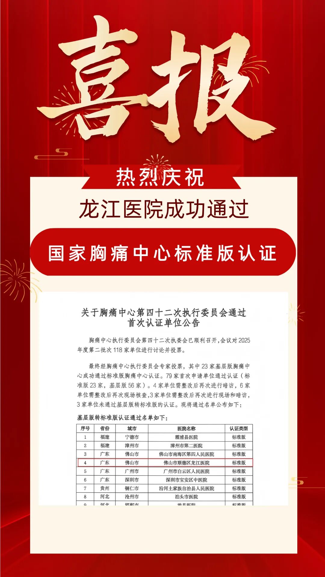 近日,中国胸痛中心总部发布《关于胸痛中心第四十二次执行委员会通过首次认证单位公告》,佛山市顺德区龙江医院胸痛中心顺利通过国家胸痛中心(标准版)认证。这标志着龙江医院在急性胸痛患者的综合救治能力、诊疗流程及医疗质量方面已达到国家级标准和水平,是医院急危重症救治体系建设的重要里程碑。
