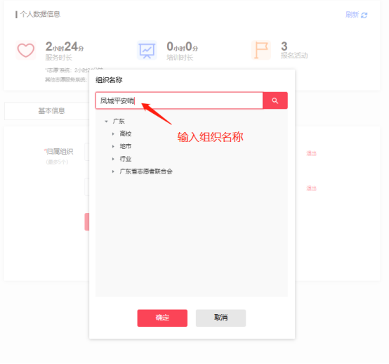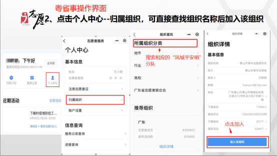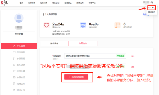 二、查找志愿者组织/团体:注册成功后,进入志愿者服务大厅首页,点击个人中心,选择归属组织。搜索需要加入的“凤城平安哨”群防群治志愿服务伦教分队,点击加入。
