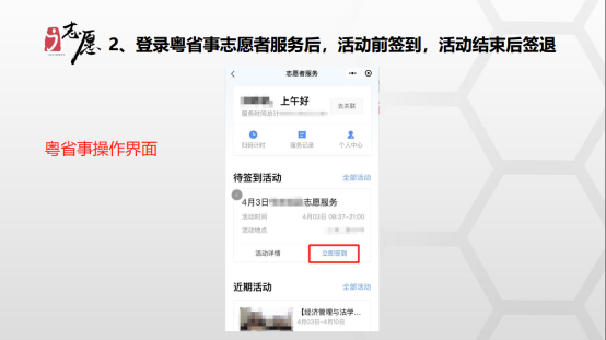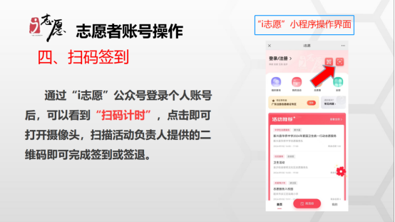 四、扫码进行活动签到:志愿者在参加线下志愿服务活动前需进行活动签到,活动结束后需进行签退,详见下图。
