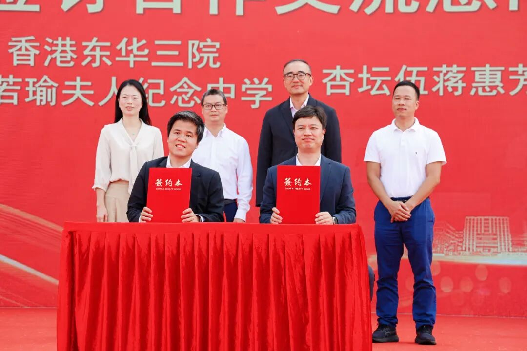 庆典现场,另一项里程碑式的举措引发广泛关注——香港东华三院伍若瑜夫人纪念中学与杏坛伍蒋惠芳实验中学共同签署合作交流意向书,约1500名校友共同见证这一重要时刻。