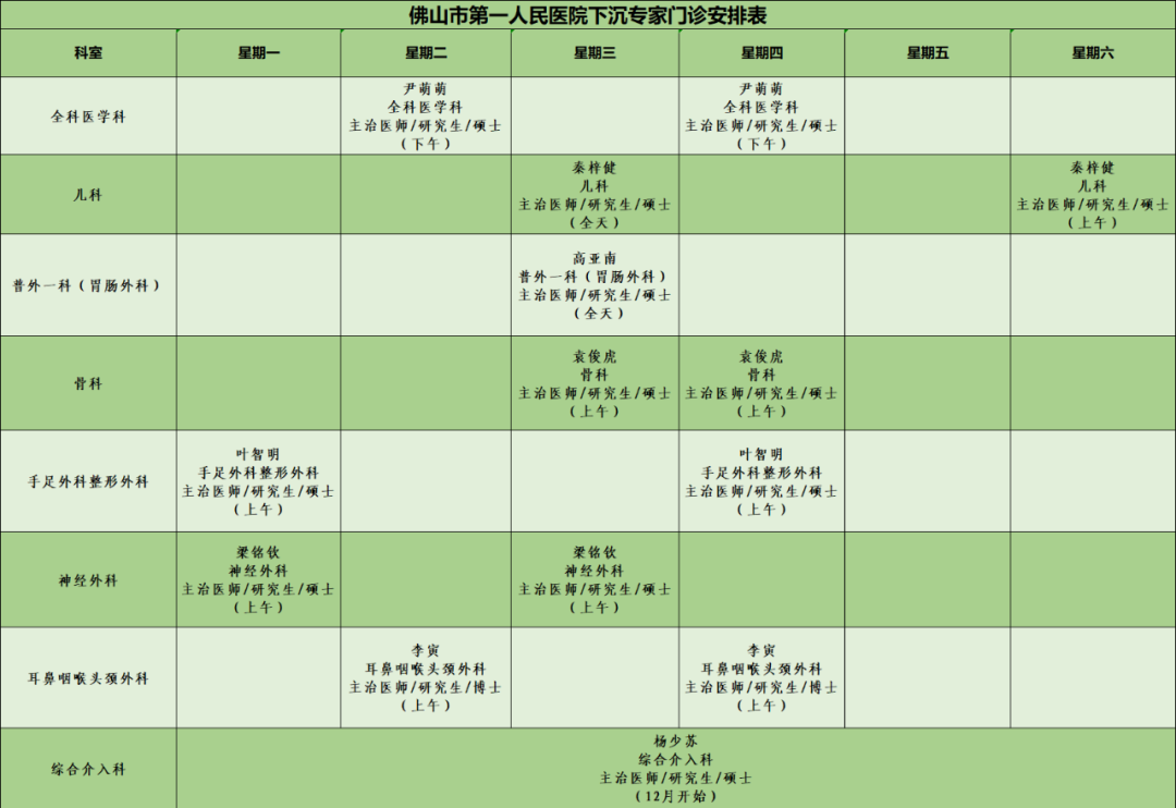 佛山市第一人民医院下沉专家开诊信息来了!