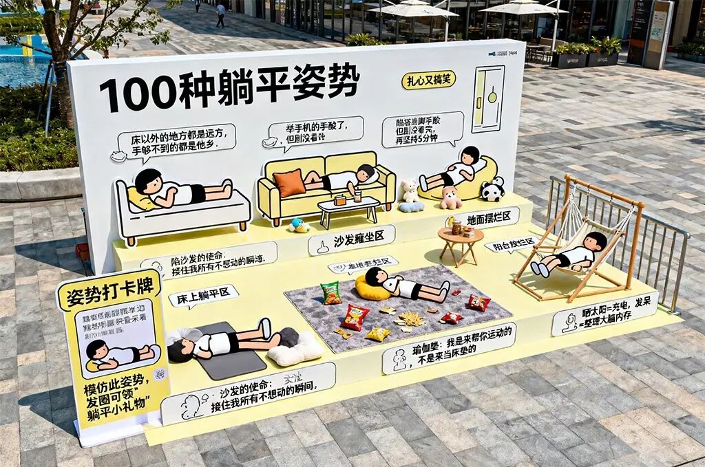 躺平的100种方式“艺术装置”“摸鱼躺平”打卡点,pose任你摆,文艺大片秒出圈。