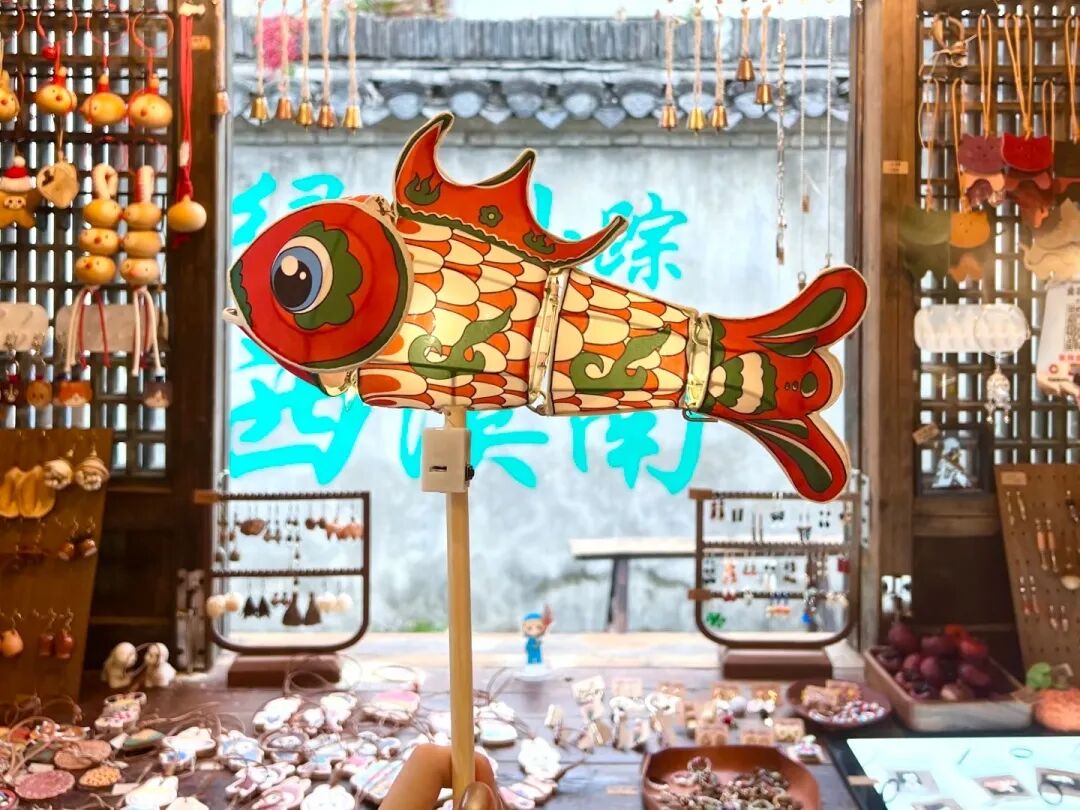 鱼灯、醒狮文创展示区,传统手艺新玩法,看了就想带回家。