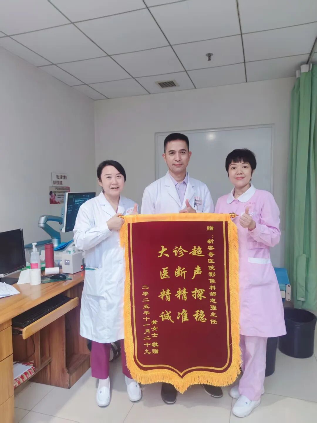 术后,孕妈妈悬着的心终于落下,脸上露出了久违的轻松笑容。为表达感激,她特地向产科与超声科分别赠送了两面锦旗,这份朴实的感谢,是对团队专业、默契与守护的最好肯定。