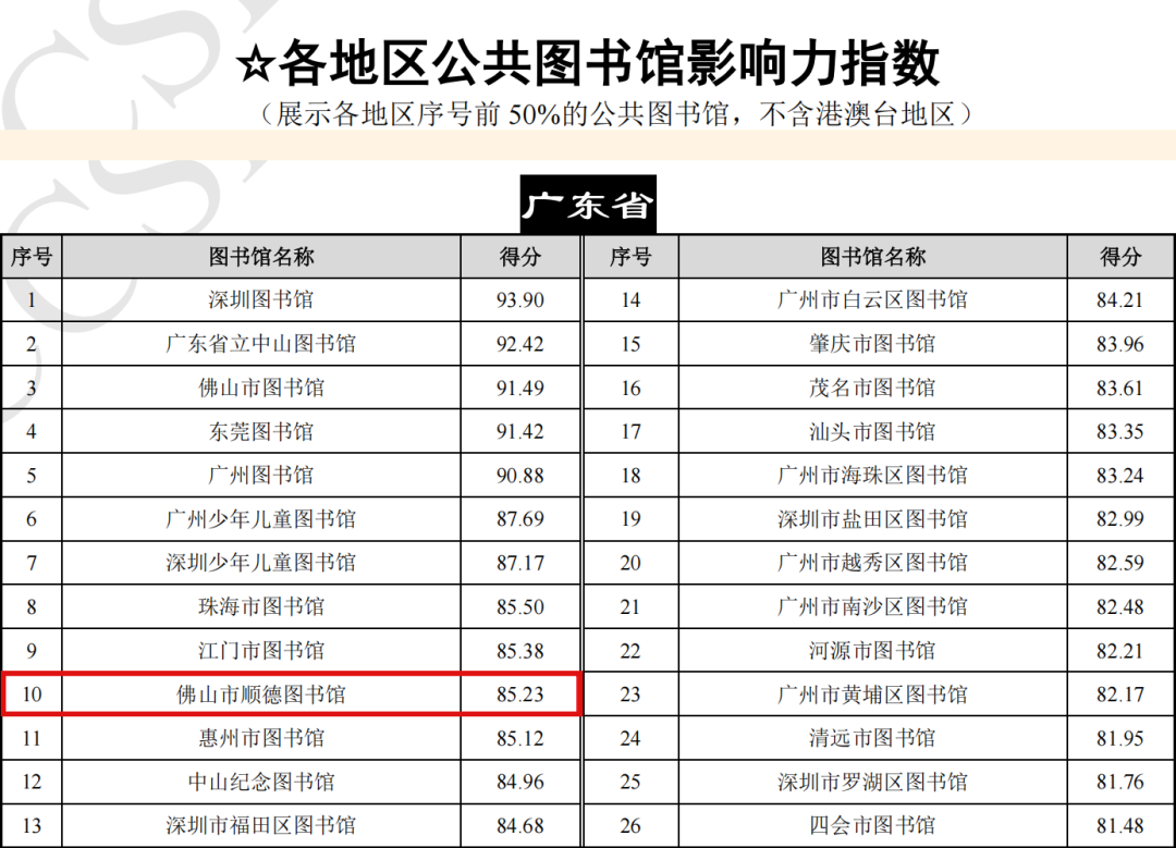 顺德图书馆在“中国公共图书馆影响力指数”