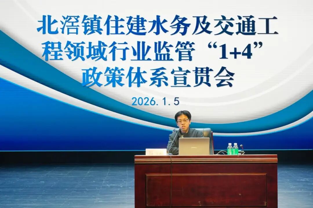 为贯彻落实顺德区住建水务及交通工程领域行业监管“1+4”政策体系,压实安全生产责任,筑牢风险防控屏障,切实维护人民群众生命财产安全与建筑市场稳定,2026年1月5日下午,北滘镇召开住建水务及交通工程领域行业监管“1+4”政策体系宣贯会议。北滘镇城建和水务办公室相关负责人、辖区内相关在建项目的建设、施工、监理单位项目负责人及劳资专管员等150余人参会。