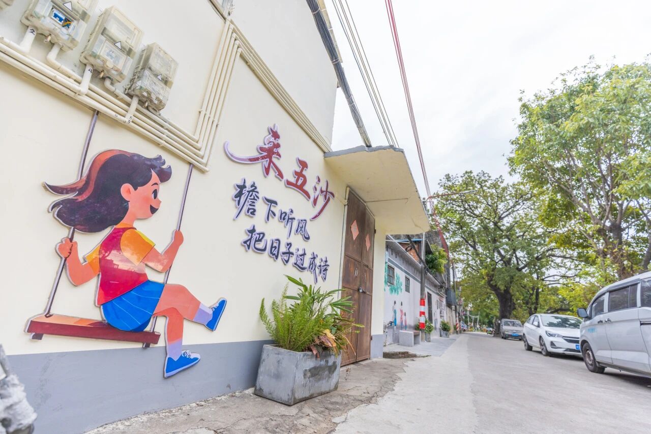 漫步其中,墙绘与绿植交织。一面彩绘描绘着昔日稻浪,转角又见工业元素融入现代生活场景,这种时空交错的视觉体验,仿佛让人在时光隧道中穿梭。墙绘旁偶尔还能遇见几位悠闲的老人,他们或坐在石凳上聊天,或手持蒲扇轻摇,脸上洋溢着满足与安详,这份宁静与和谐,正是五沙社区慢生活的最佳注脚。
