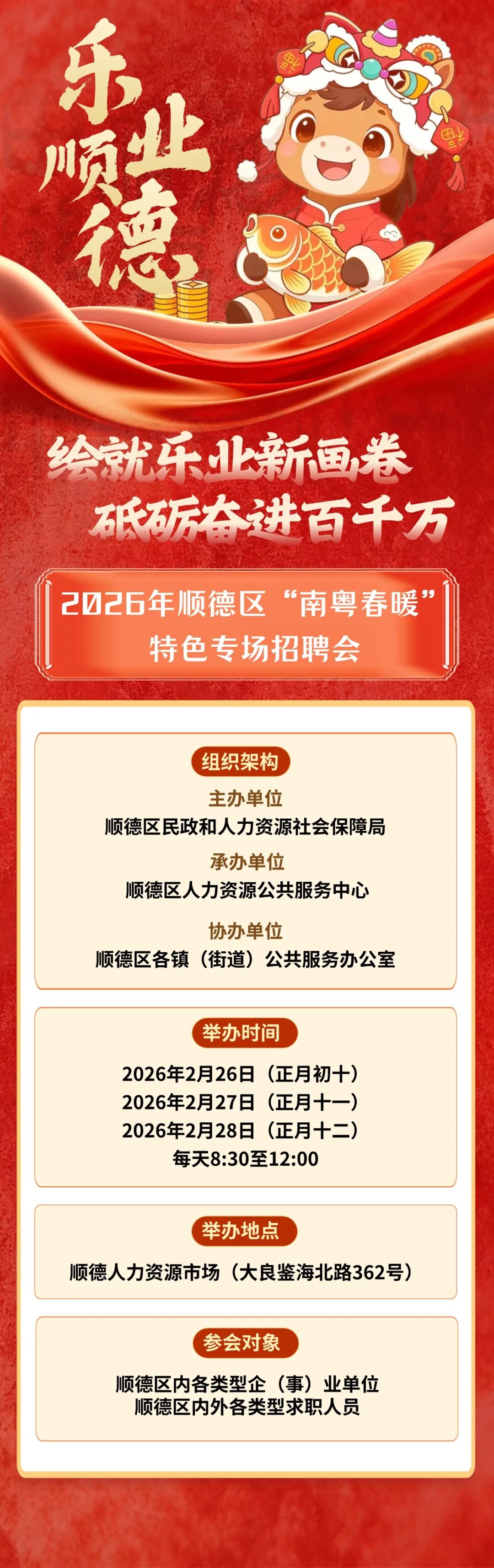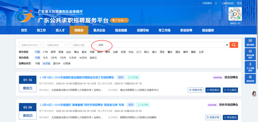 01.搜索并报名招聘会:点击“招聘会”,通过顶部搜索条件搜索“顺德”,可点击【查看详情】了解各场招聘会信息,点击【报名参加】进入招聘会报名界面。