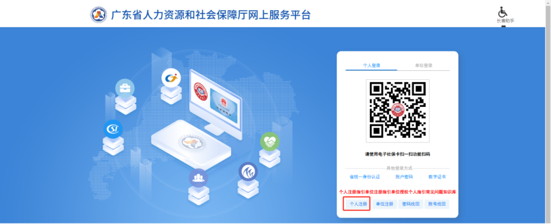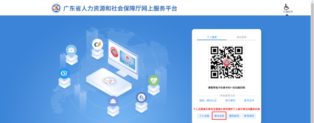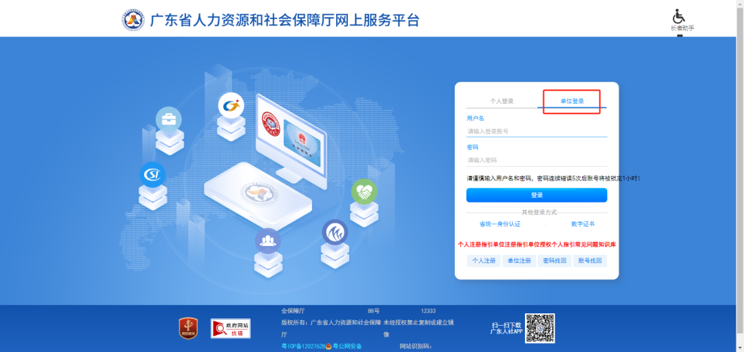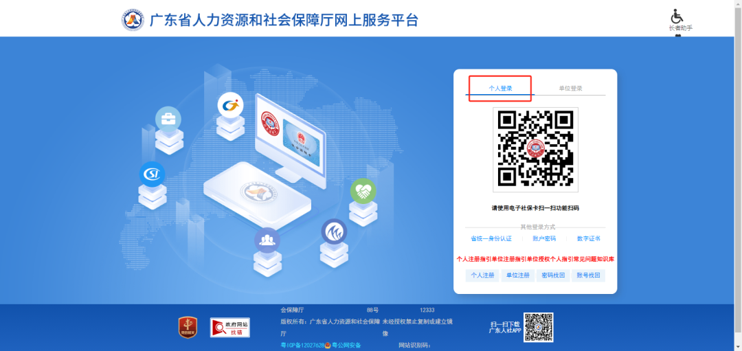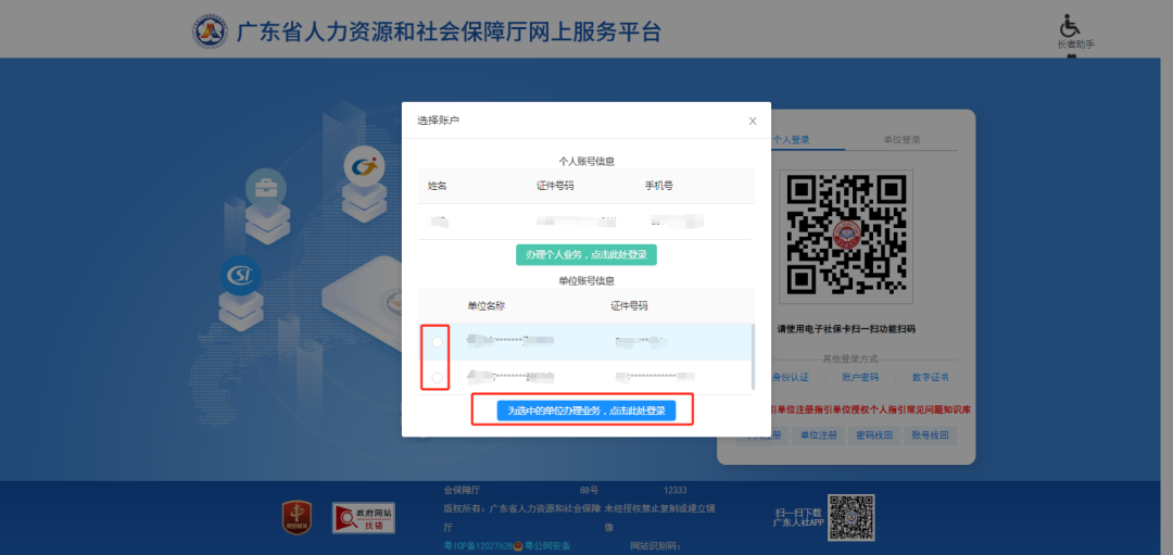方法二:广东公共求职招聘服务平台→右上角“登录”→个人登录(登录方式可选择电子社保卡扫一扫/省统一身份认证/账号密码)→登录后选择以单位身份登录账号