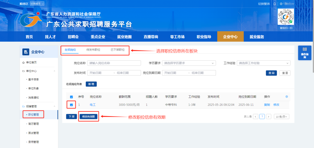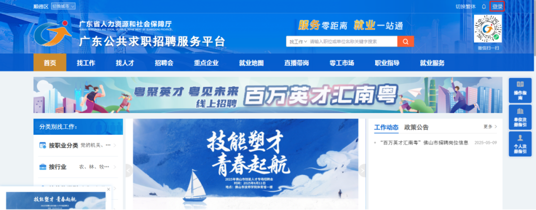 方法一:广东公共求职招聘服务平台→右上角“登录”→单位登录(企业账号密码登录)