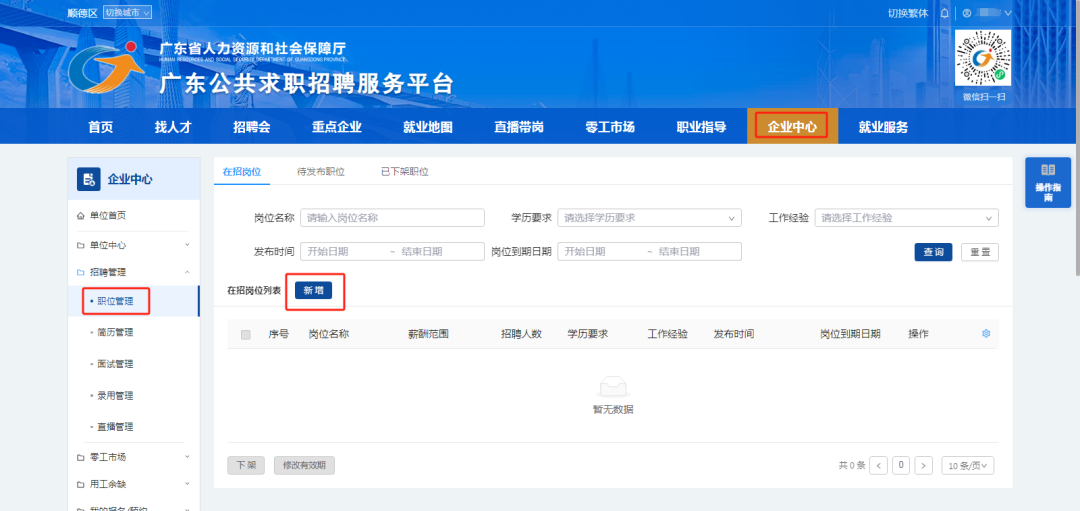 01. 广东公共求职招聘服务平台→登录单位账号→【企业中心】→【招聘管理】→【职位管理】→【新增】→填写岗位信息