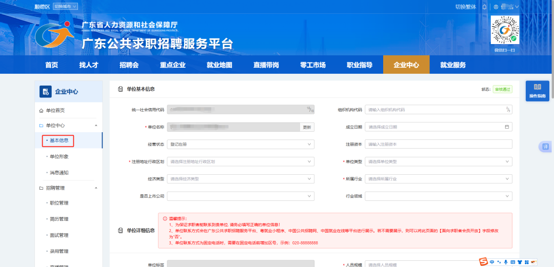 首次登录须完善单位信息:进入广东公共求职招聘服务平台,点击【企业中心】—【单位中心】—【基本信息】界面填写单位信息。完成后点击【保存并提交审核】。