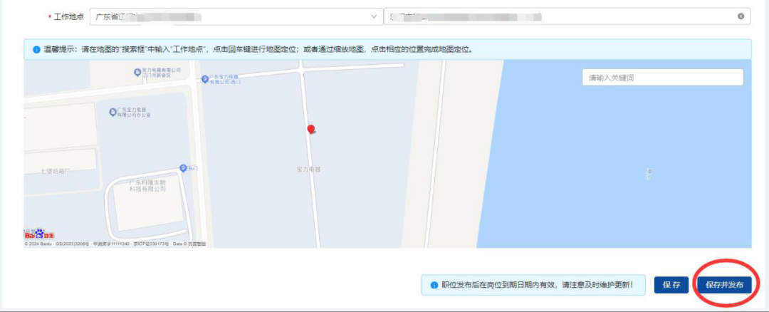 02.完善招聘职位信息,带*号的为必填项。认真核对确认后,点击【保存并发布】将该职位信息发布。可点击【保存】按钮保存职位信息,后续继续修改,也可点击【保存并发布】将该职位信息发布。