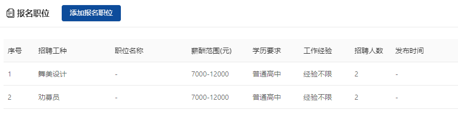 (注意:报名企业务必认真填写招聘岗位信息,必须确保岗位信息真实有效,并对此负责。岗位“薪酬”方式分别有月薪(元/月)、年薪(万元/月)、面议三种,填写薪酬范围时请务必注意与“薪酬”方式相匹配;填写的最低月薪工资不能低于我市最低工资。“岗位描述”填写岗位要求,不可以出现性别、宗教、民族、种族、年龄、户籍等歧视性条件。)
