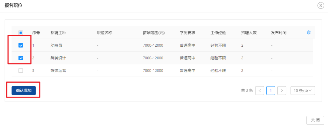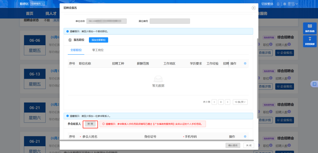 02. 在报名招聘会界面,点击【添加报名职位】→勾选已发布职位中要报名参会的职位→点击【确认添加】→点击【新增参会联系人】→填写基本信息→【保存】→点击【确认报名】→等待后台审核,审核通过即为报名成功。(注意:参会人姓名需填写真实姓名)