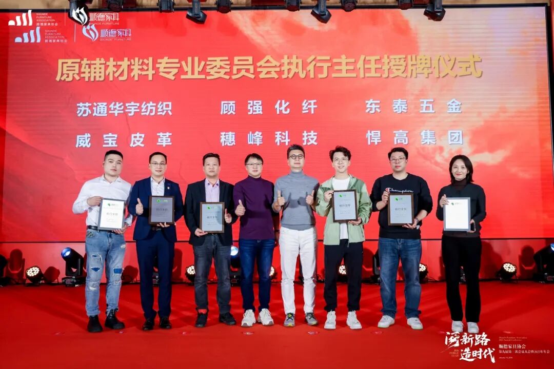 为顺德家具协会原辅材料专业委员会执行主任佛山市苏通华宇纺织贸易有限公司、佛山市顾强化纤制品有限公司、广东东泰五金精密制造有限公司、广东威宝皮革有限公司、广东穗峰科技实业有限公司、悍高集团股份有限公司颁牌。