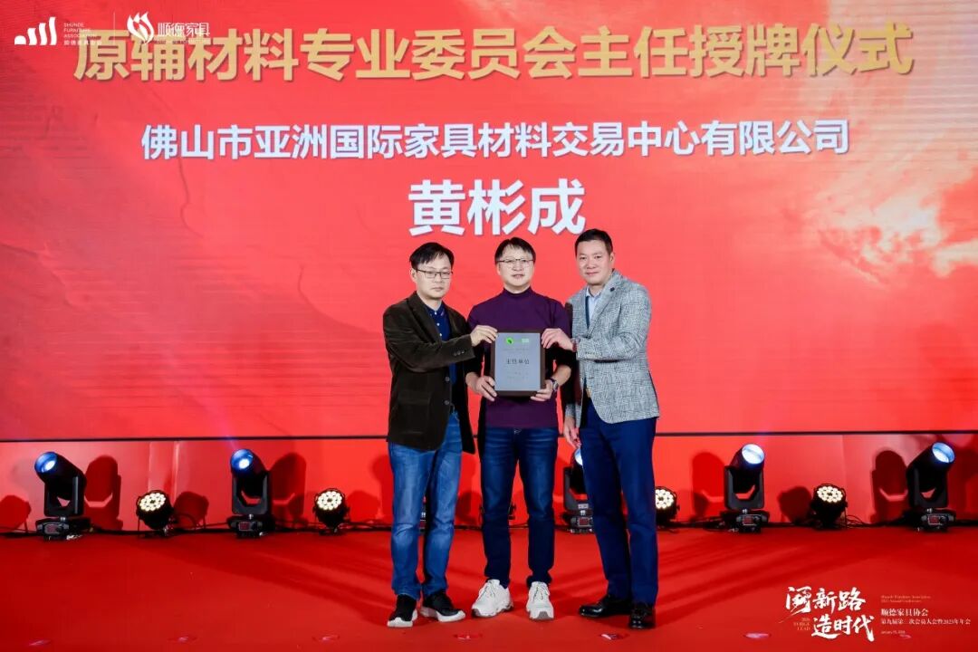 为顺德家具协会原辅材料专业委员会主任佛山市亚洲国际家具材料交易中心有限公司黄彬成颁牌。