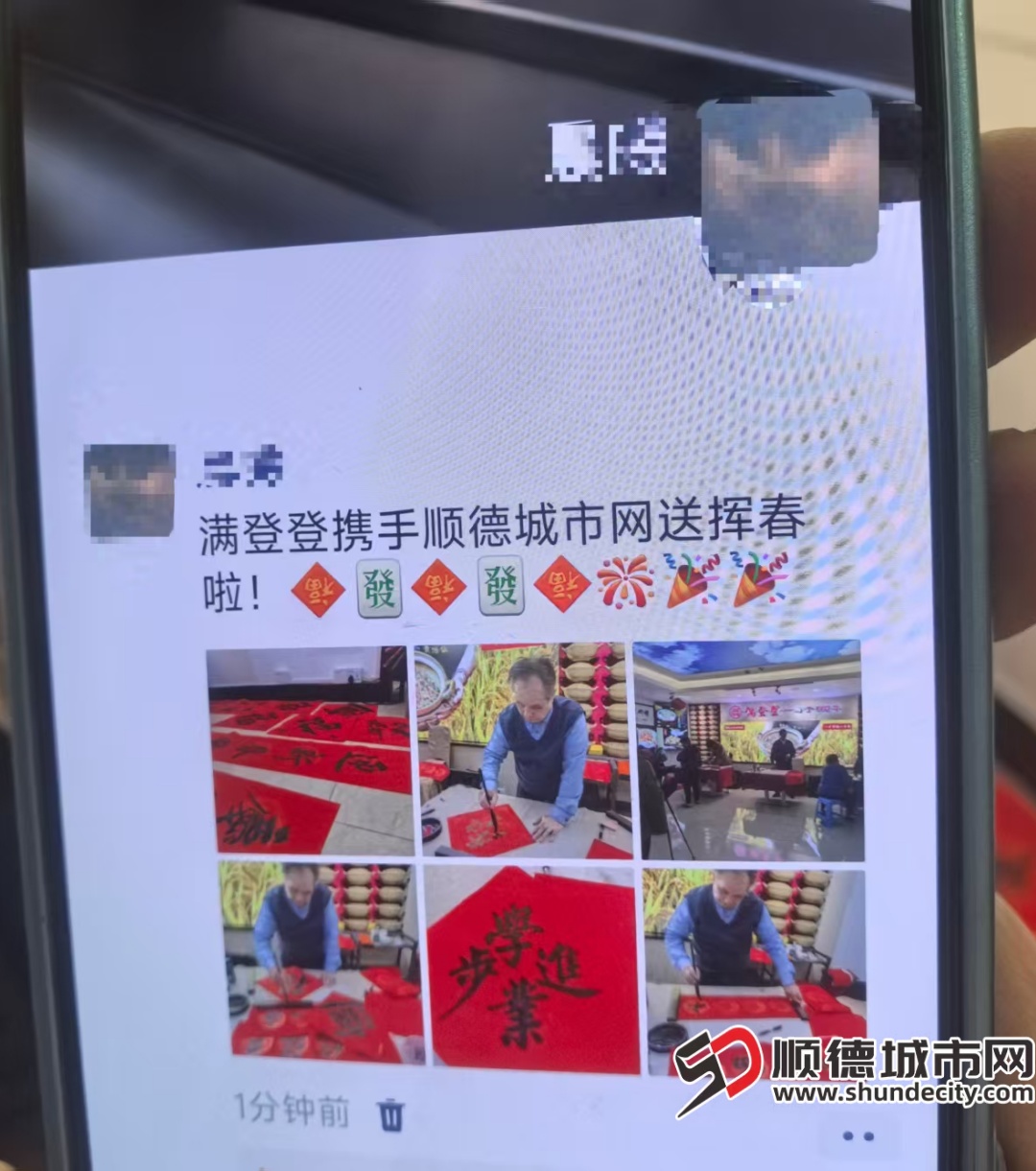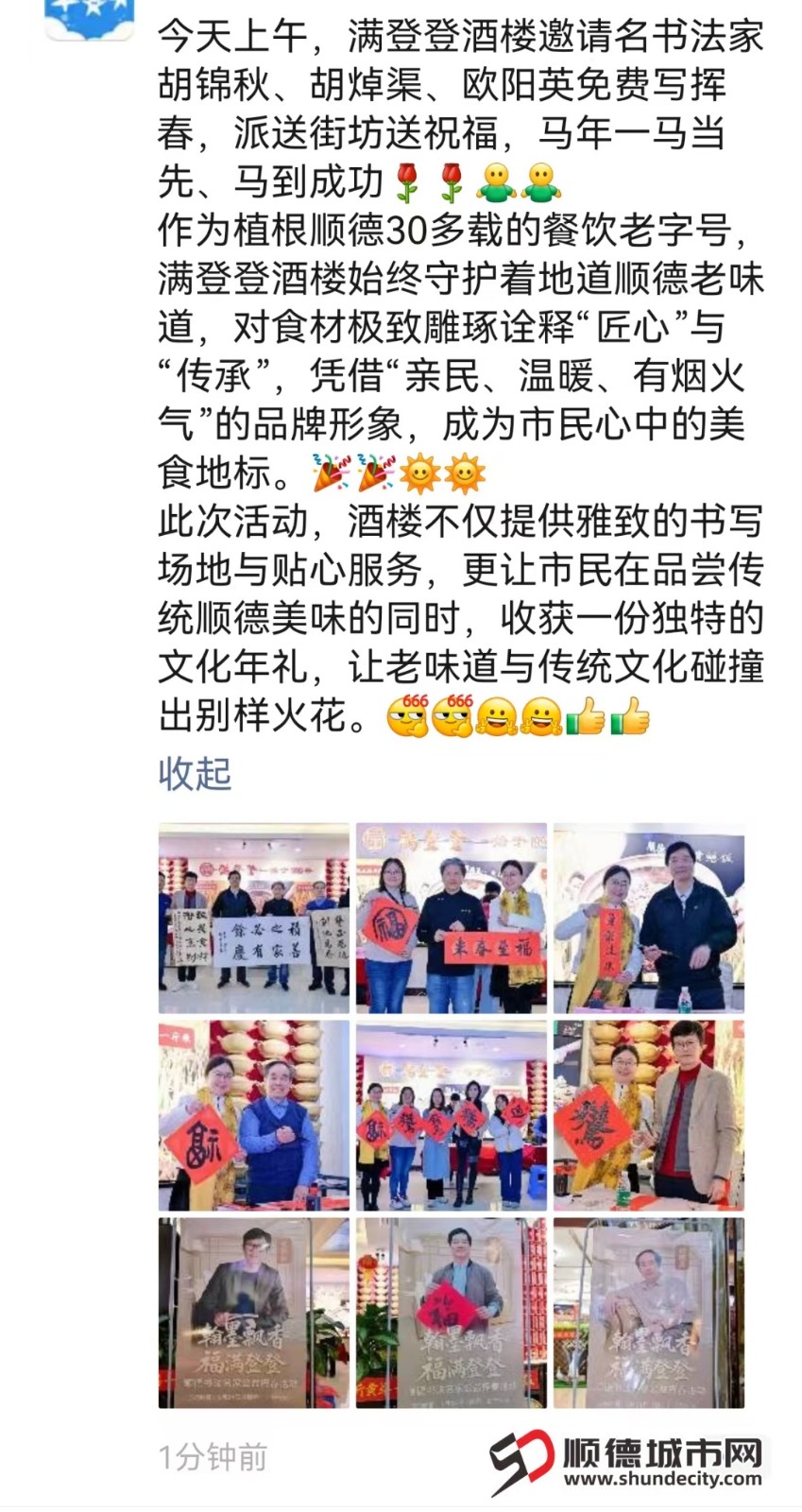 1月24日上午,容桂满登登酒楼二楼前厅暖意融融、翰墨飘香,由顺德城市网与佛山老字号满登登酒楼联合主办的“翰墨飘香·福满登登”顺德书法名家公益挥春活动温情启幕。