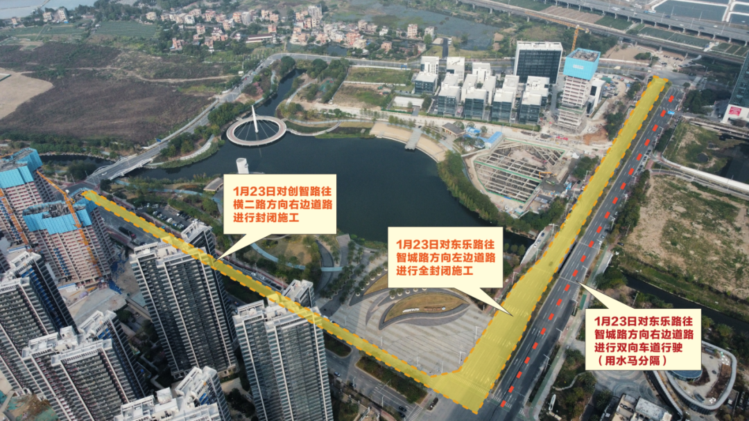 管制措施:对东乐路往智城路方向左边道路进行全封闭施工,对右边道路实行双向车道行驶。对创智路往横二路方向右边道路进行全封闭施工。