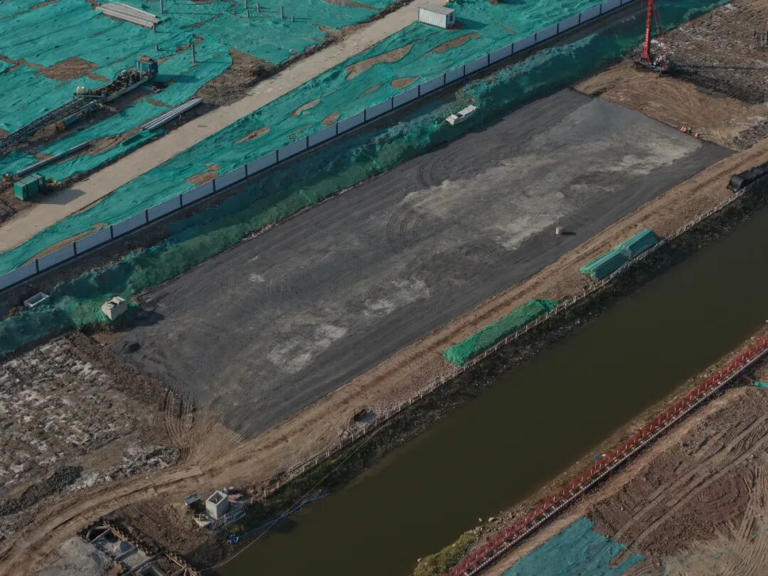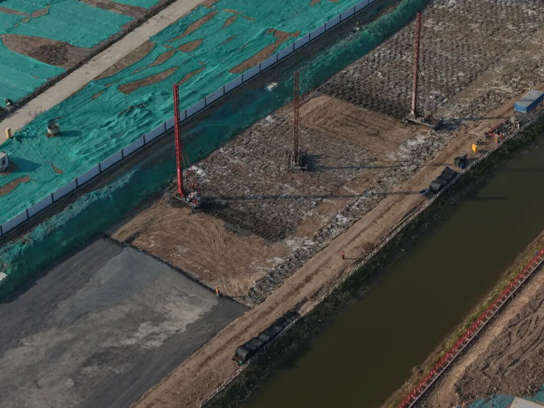 鸿源路正在进行路基换填、搅拌桩施工及雨污水管道铺设。