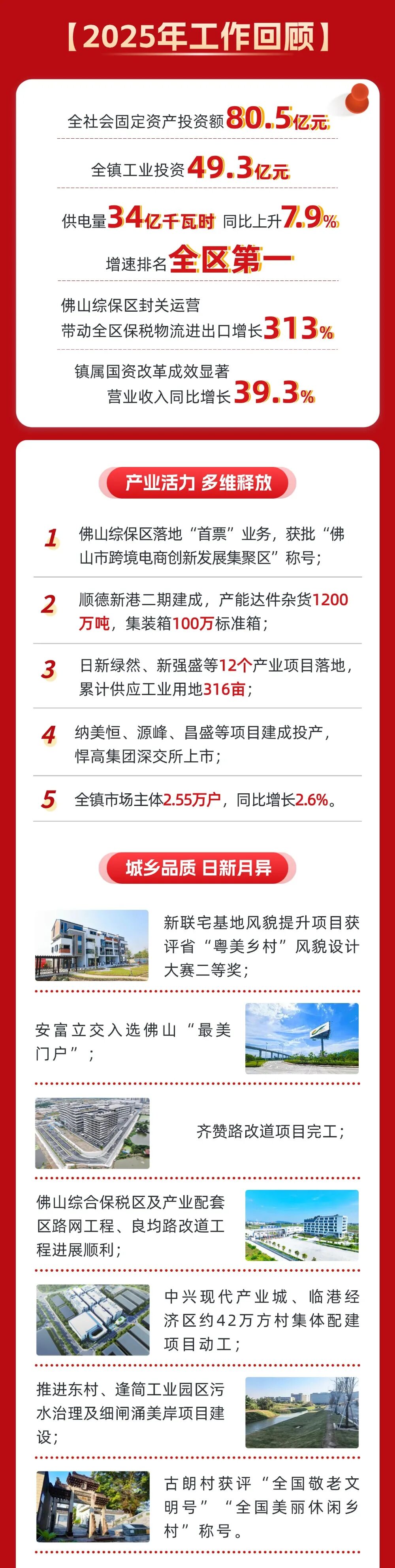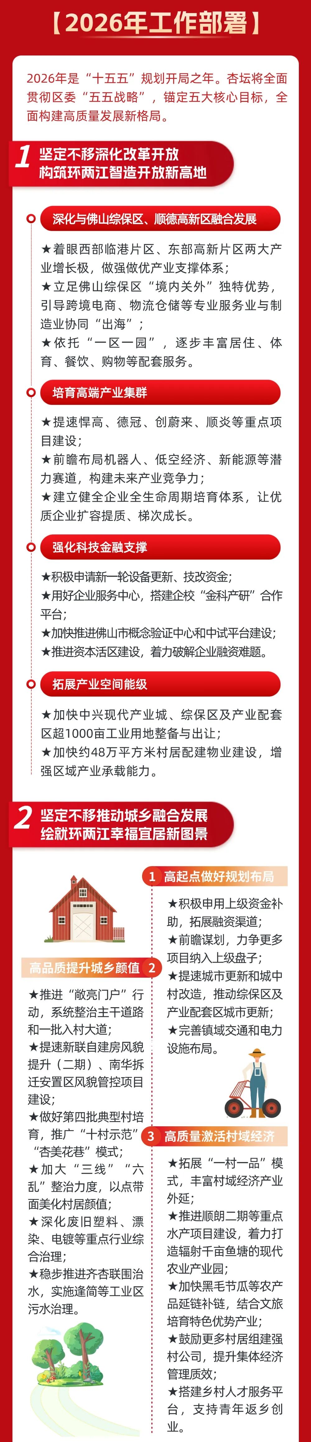 2026年是“十五五”起步之年,站在新的发展起点上,杏坛将锚定“构筑环两江制造开放新高地”“绘就环两江幸福宜居新图景”“争创岭南文化精致小城新样本”“增进可触可感可及新福祉”“打造共建共治共享新格局”具体目标,争创更多精彩,迈好“十五五”开局第一步。