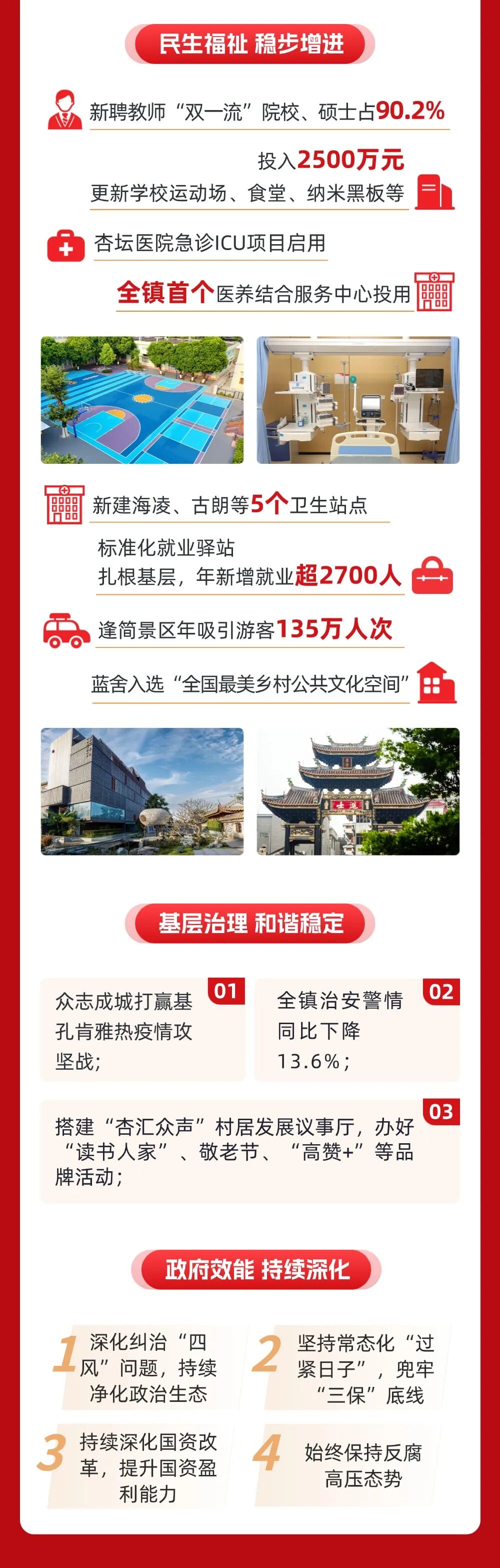一年来,杏坛投入2500万元为学校更新运动场、食堂、纳米黑板等,新聘教师中“双一流”院校毕业生、硕士占比90.2%,孩子们的教育条件更加优质;启用杏坛医院急诊ICU项目,全镇首个医养结合服务中心投用,新建海凌、麦村、古朗等5个卫生站点,15分钟医疗圈更加完善。标准化就业驿站扎根基层,新增就业超2700人。文旅事业精彩纷呈,逢简景区年接待游客135万人次,轻餐饮、音乐会等年轻业态推动夜间经济提质,蓝舍入选“全国最美乡村公共文化空间”。