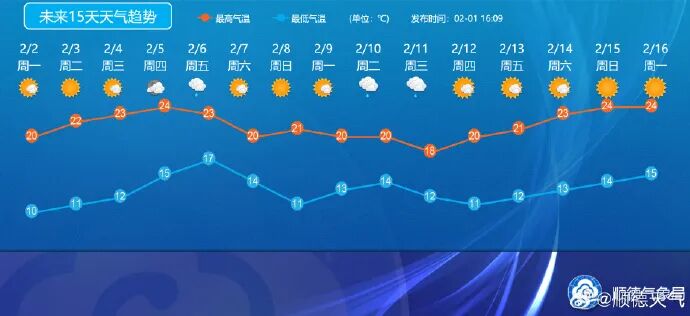 预计2026年2月,顺德区主要有4次主要的降水过程,大致出现在:5-6日(分散小雨)、12-14日(小雨)、17-20日(小雨)和25-28(小雨)