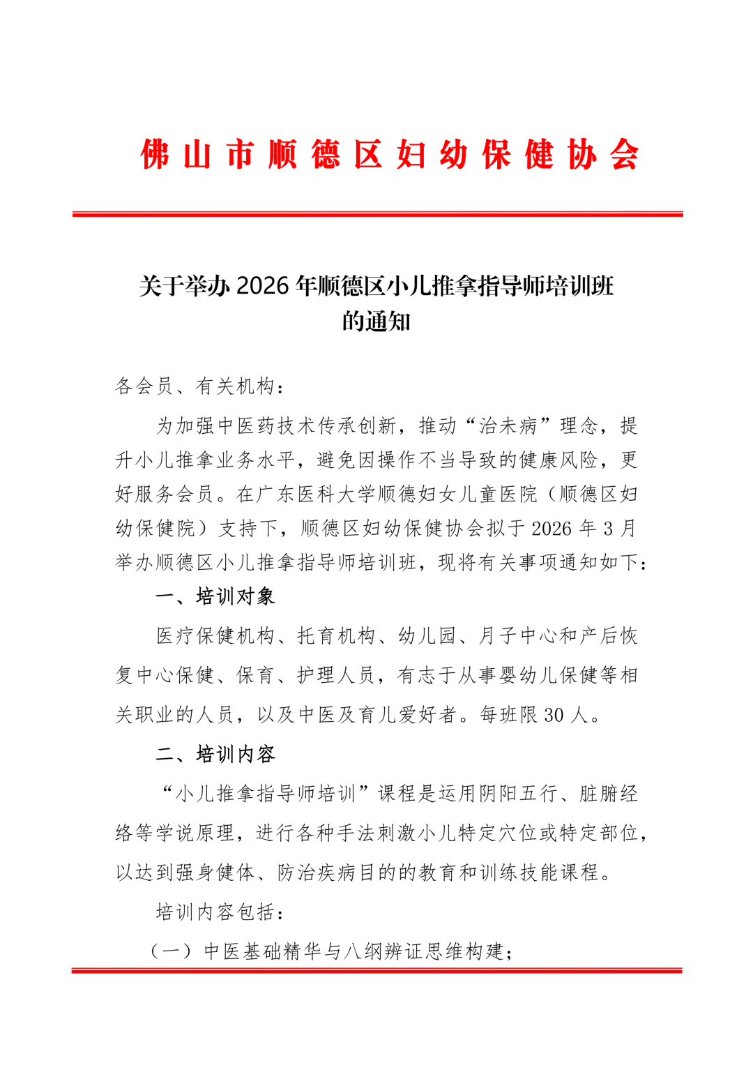 为加强中医药技术传承创新,推动“治未病”理念,提升小儿推拿业务水平,避免因操作不当导致的健康风险,更好服务会员。在广东医科大学顺德妇女儿童医院(顺德区妇幼保健院)支持下,顺德区妇幼保健协会拟于2026年3月举办顺德区小儿推拿指导师培训班,现将有关事项通知如下: