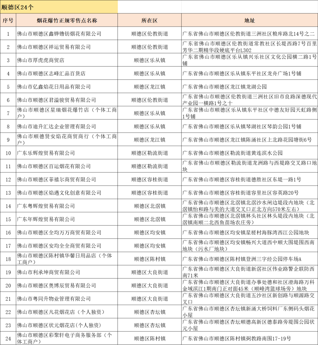 截至2月4日,全市五区共审批发证烟花爆竹正规合法零售点81个,其中顺德区24个,另有部分零售点正在审批,日后“佛山应急管理”微信公众号将公布更新名单,敬请关注。