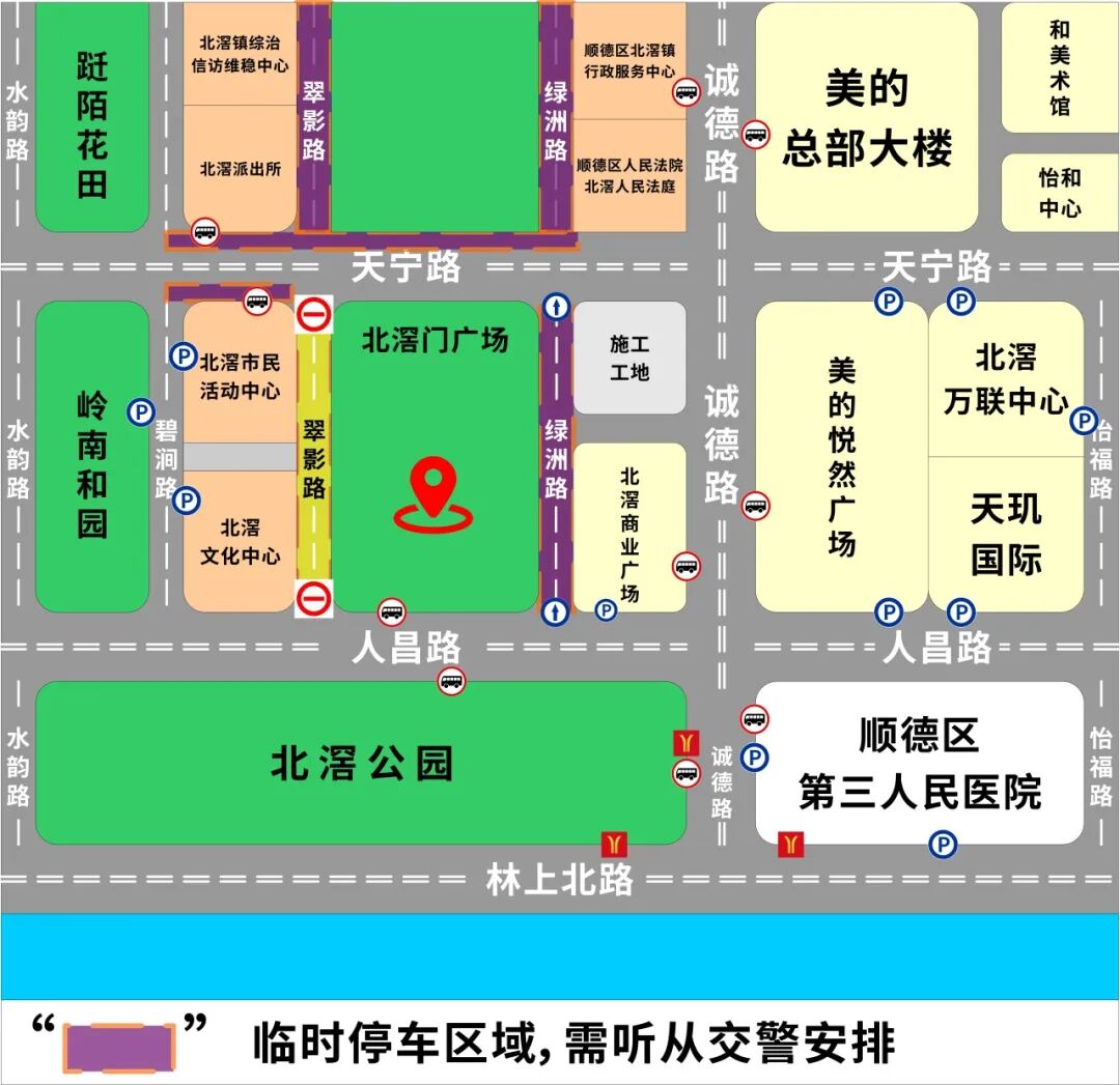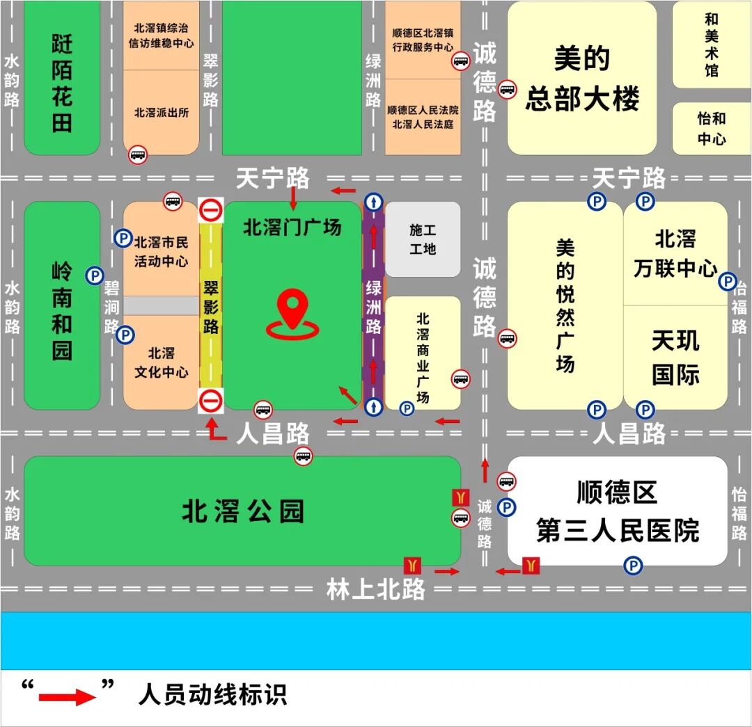 交通管制路段:人昌路(北滘公园至北滘文化活动中心路段)、翠影路(北滘文化中心至北滘市民中心对出路段)、绿洲路(北滘商业广场至北滘镇人民法院路段实行单行通行)。