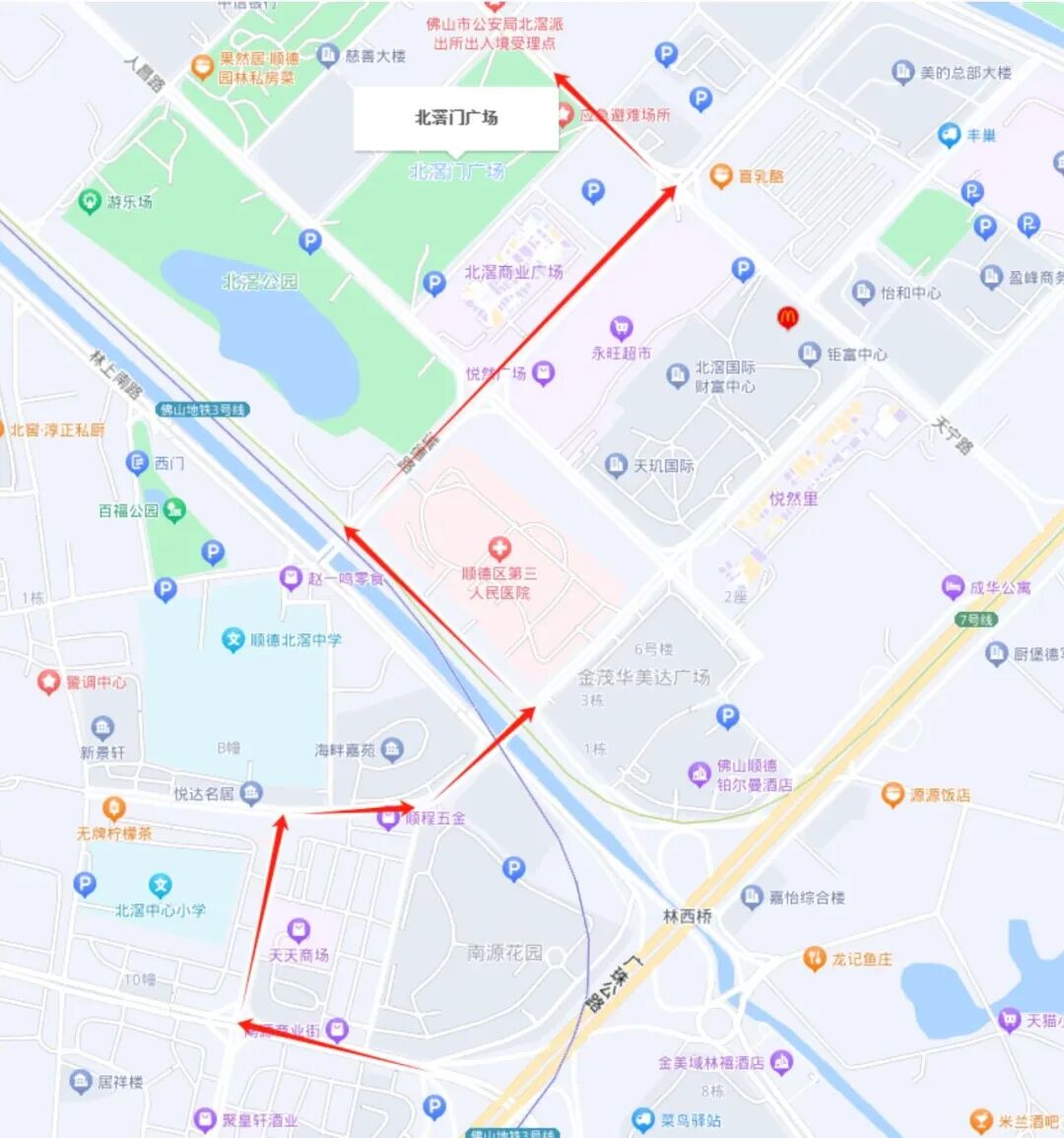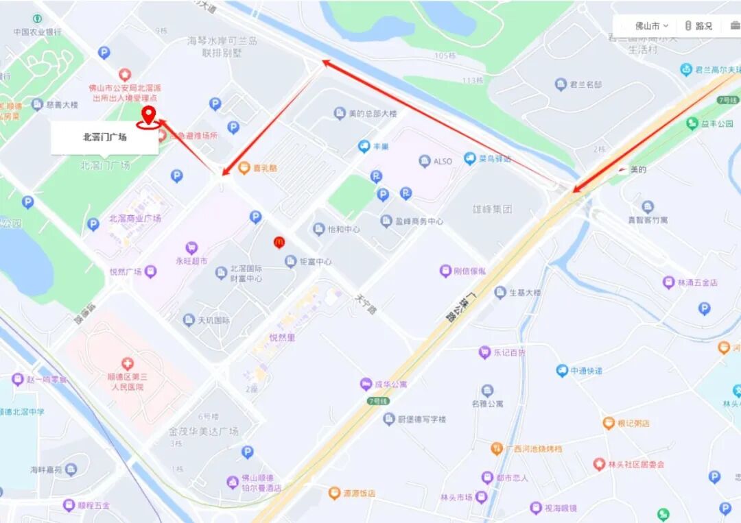 路线:105国道→美的大道→诚德路→天宁路→北滘门广场