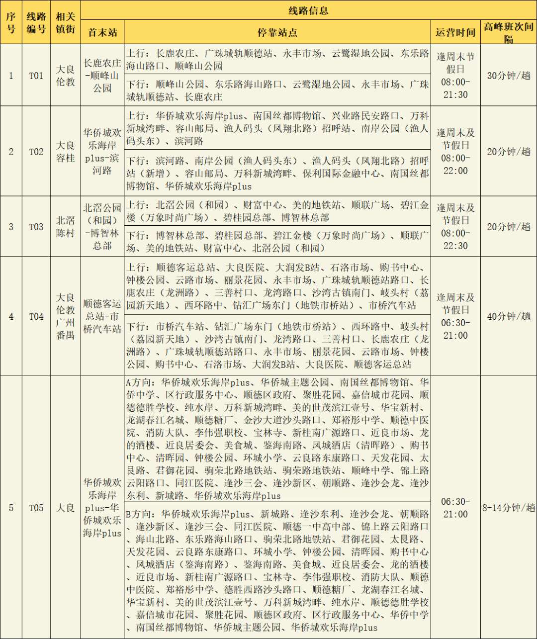 T01 凤岭流光·中轴拾趣线(长鹿农庄-顺峰山公园):串起长鹿农庄、678文化街、顺峰山公园等大良中轴精华,接驳城轨顺德站、驹荣北路地铁站等枢纽。目前已开通T01万象汇—顺峰山公园区间段,桂畔海大桥通车后可全线运营。