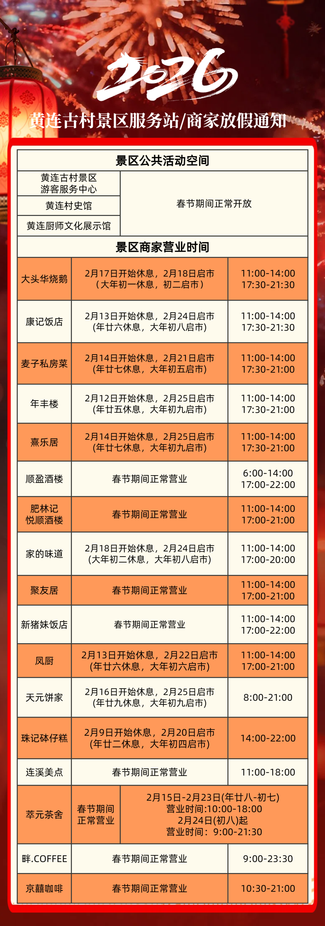 2月16日-2月23日(年廿九到正月初七)营业时间调整为12:00-18:00