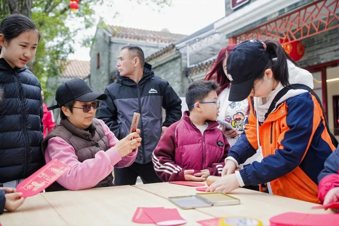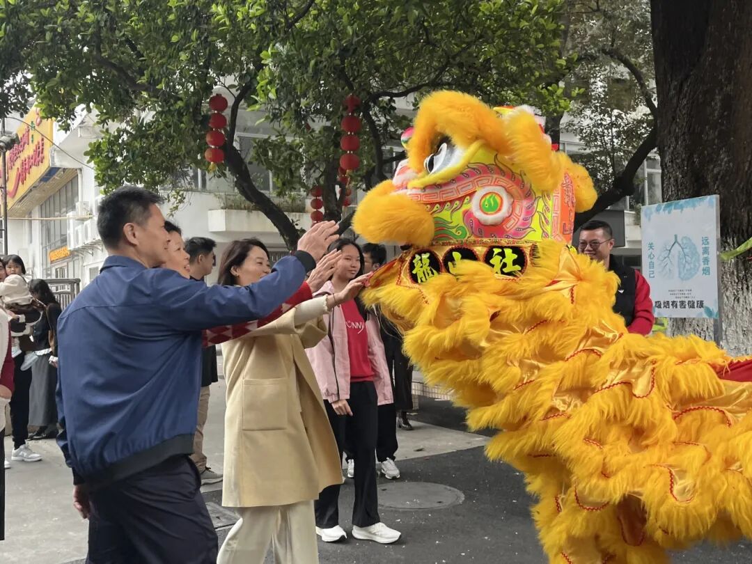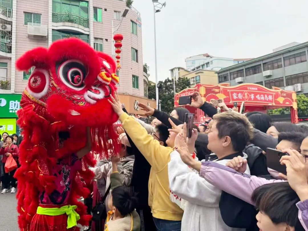 活动现场,人流如织。由祥龙、醒狮、锣鼓柜、飘色与吉祥财神等组成的祈福队伍环绕文塔展开巡游;非遗体验区内,剪纸、版画拓印、书法等手作项目前排起长队,新春祈福墙上写满生活美满、事业顺遂的殷切期许;表演区内,六头醒狮轮番献艺,互动环节更让市民得以触摸狮头、接福纳吉。