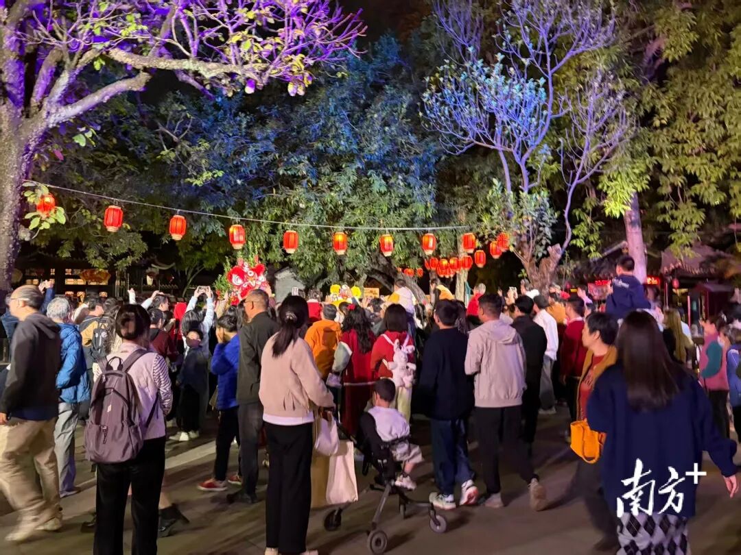 2月17日,顺德欢乐海岸PLUS园区内张灯结彩,金龙醒狮、财神巡游等多场年俗活动轮番上演。