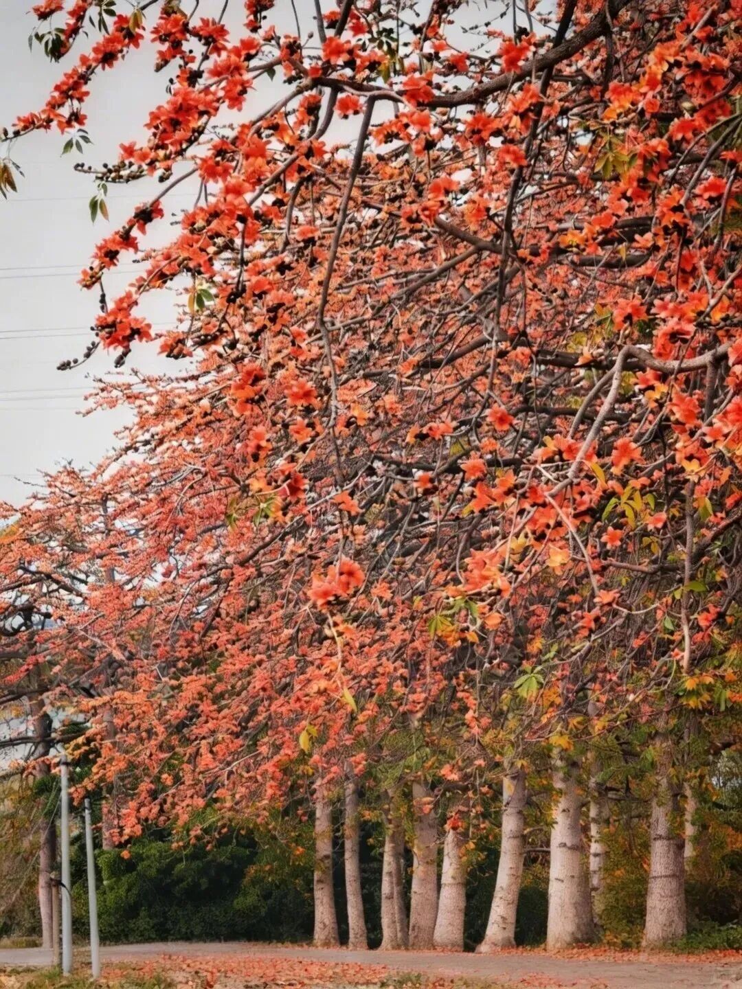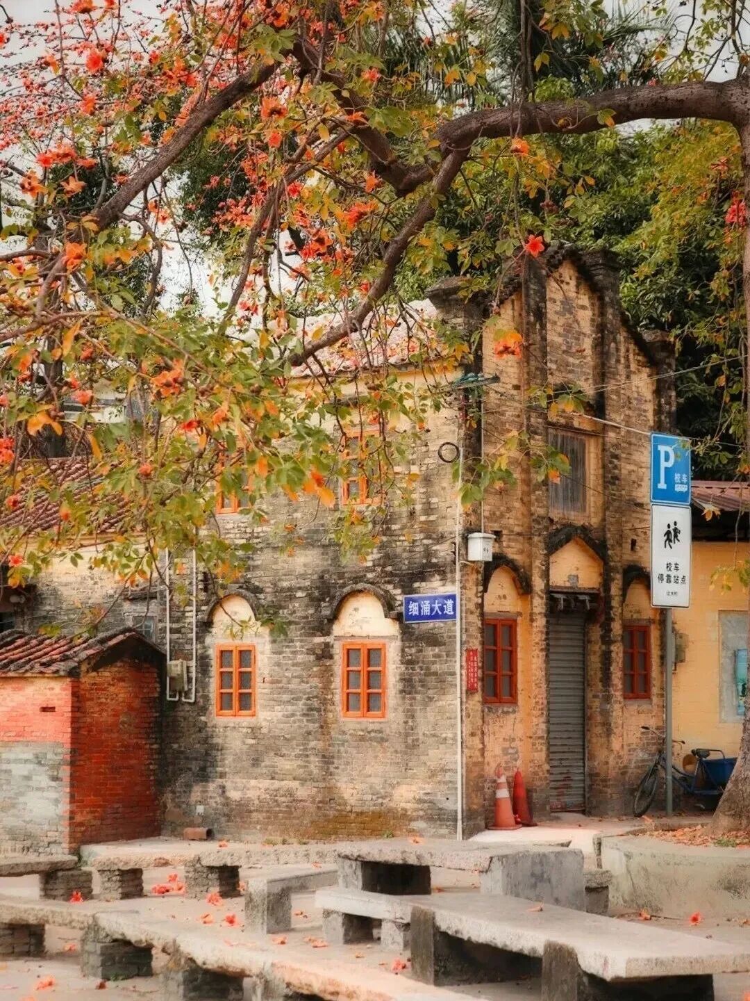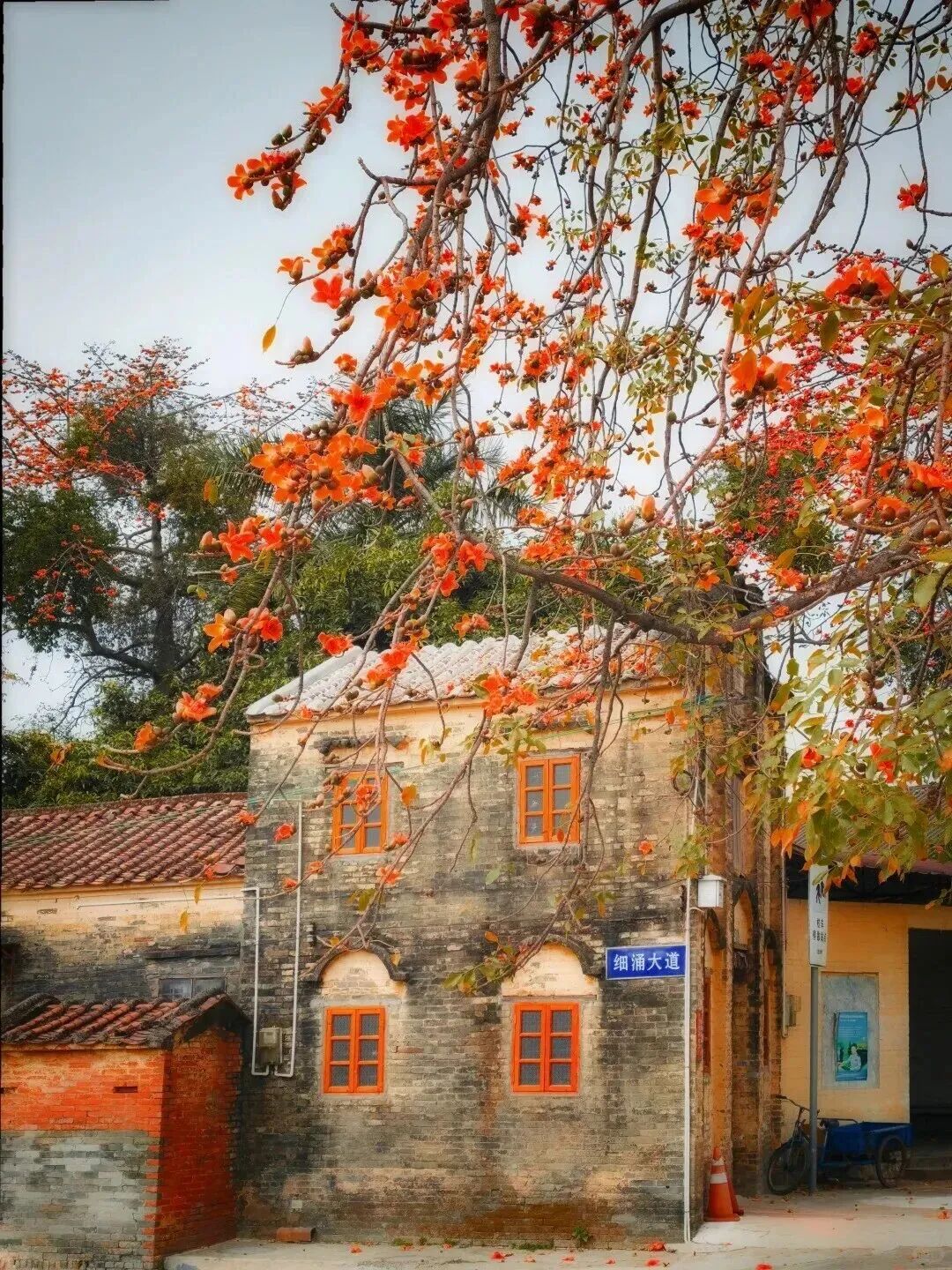 在杏坛北水村,橙色的木棉花正值盛放期——不同于大红木棉的烈火灼人,这里的木棉是温润的暖橘金,阳光底下泛着柔光,与古村的青砖白墙、西江水面相映成画,随手一拍都是电影感水乡大片。
