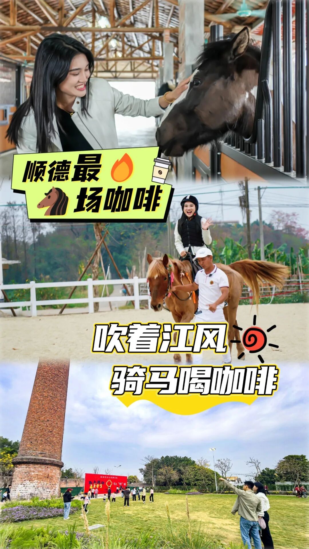 从废弃砖厂到网红“马场咖啡”,那支顶天立地的大烟囱,见证了均安工业时代的荣光,也见证了这片江岸的蝶变新生。咖啡香、马蹄声、江风、花海、落日、烟花——在这里奇妙地融合成一种全新的“微度假·慢生活”方式。