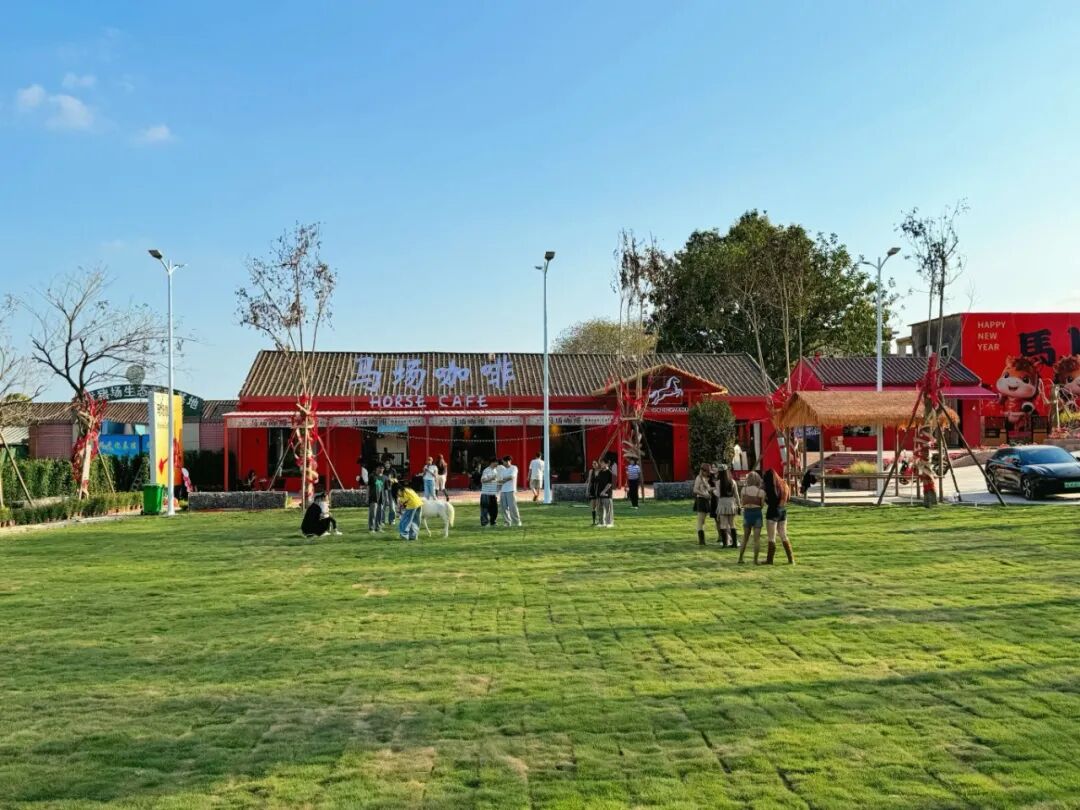 眼前就是马场,马儿们在草地上慢悠悠地吃草、散步。你手里端着一杯拿铁,风吹过木棉花,偶尔有一两朵落在脚边。抬头是江景,低头是咖啡,远处还有马蹄声传来。