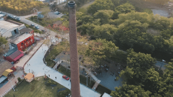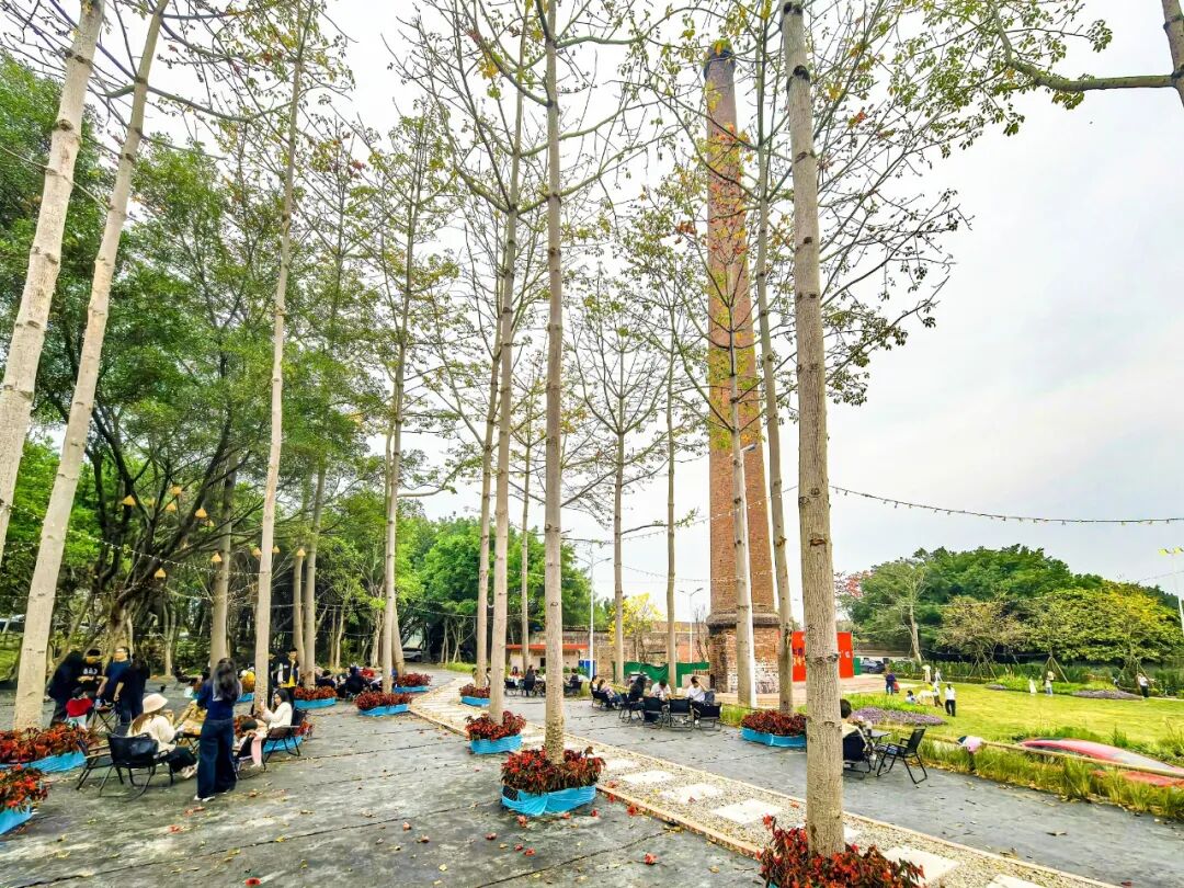 这里曾是均安工业时代的印记,那支“顶天立地”的红色大烟囱,是均安最后一支留存下来的工业烟囱,像一根定海神针,守着西江日出日落。砖厂停产后,这片约185亩土地一度闲置。