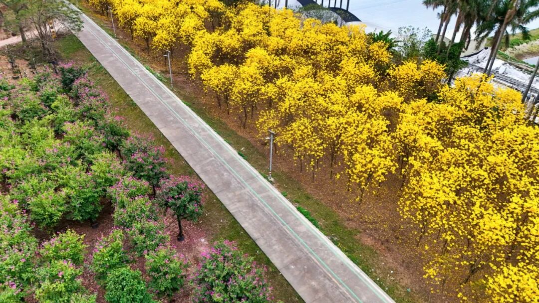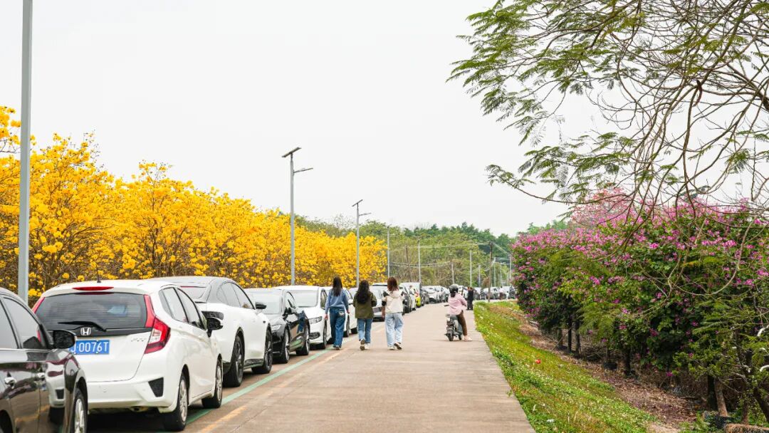 往马场去的堤围边,有一片超好拍的黄花风铃木,春天正值花期。紫荆花也开了,随手一拍都是春日氛围感。