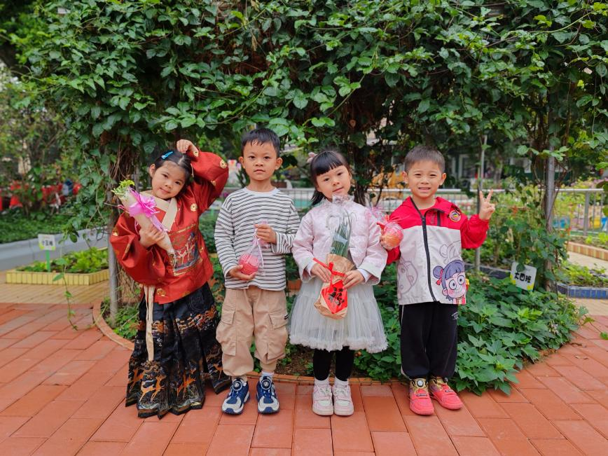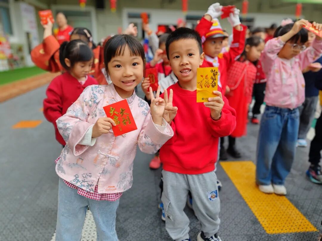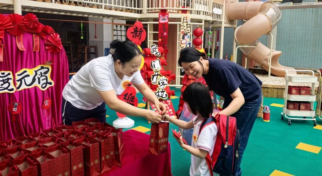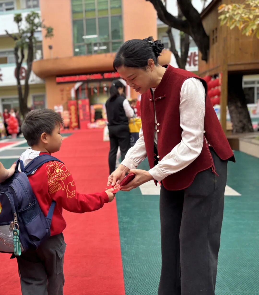 在勒流中心幼儿园的入口,身着汉服的小小迎宾使者,以稚嫩的嗓音传递“新年快乐”的祝福;老师为孩子们送上“开学红包”“福盒”;小朋友们触摸吉祥食物,橘子(大吉大利)、甘蔗(节节高升)、火龙果(红红火火)、棒棒糖(学习棒棒)……