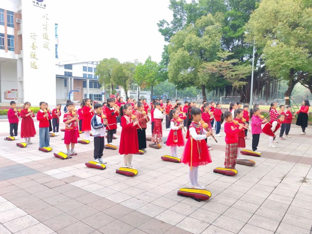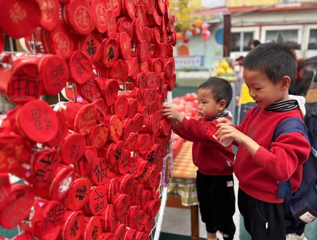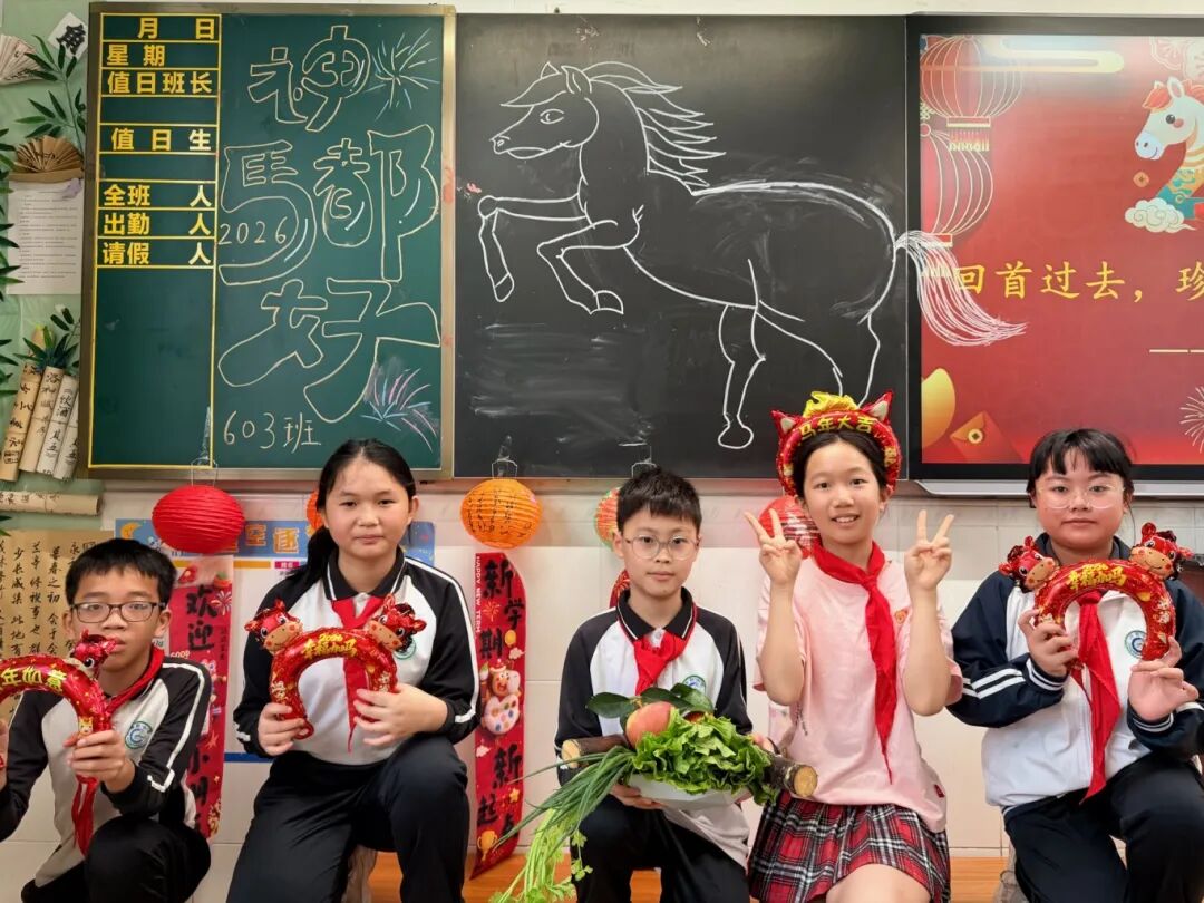校门口打造沉浸式迎新场景,葫芦丝社团奏响《新年好》,同学们带来活力满满的手势舞《天地龙鳞》;承载谐音美好寓意的物品整齐摆放,孩子们轻轻触摸,沾喜气、学知识。