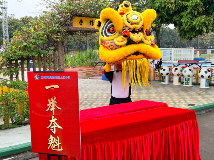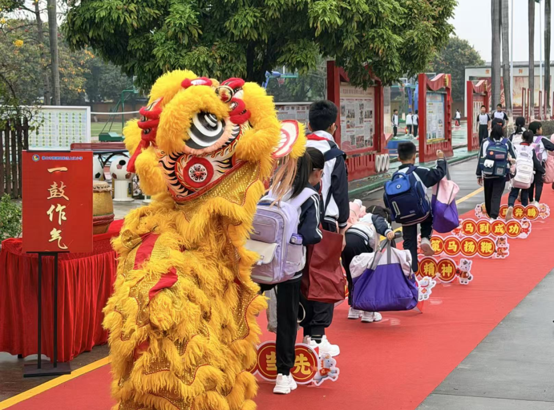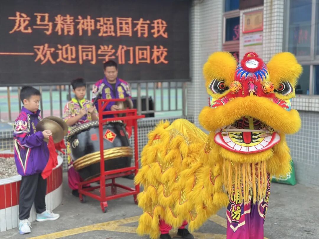 孩子们往杯子装入大米、红豆、花生等五谷杂粮,寓意“集百家米、纳百家福”。开学集会上,醒狮踏着铿锵的鼓点登场,引得孩子们阵阵欢呼,将开学的喜庆氛围推向高潮。