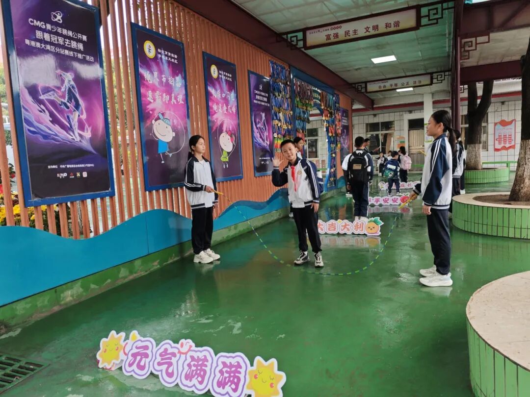 勒流育贤实验学校东风校区将学校的强势项目跳绳与美好祈愿紧密结合,学子们进入校门后依次在绳中轻盈跳跃,有序跨过写有“健康”“平安”“快乐”等祝福语的横栏,每一次落地,都寓意着将平安喜乐稳稳收入行囊。