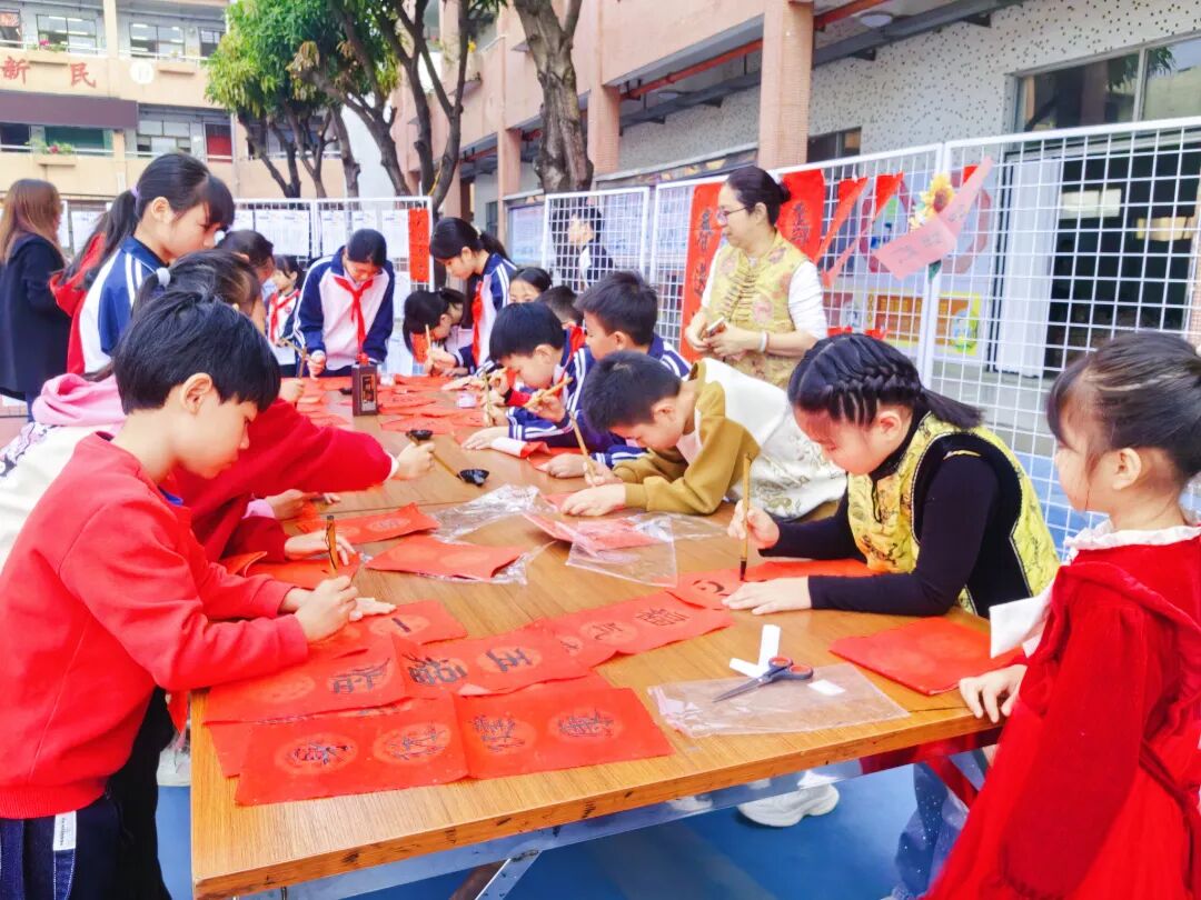 新龙学校的开学仪式充满学校特色。醒狮社团在入口处带来精彩的醒狮表演,热烈的氛围点燃开学喜悦。书法队的同学们现场挥毫泼墨,写“福”字赠予师生。福字拓印体验区更是人气满满,孩子们手持红纸与拓印模具,在老师的悉心指导下认真涂墨、轻压拓印,一个个圆润的福字跃然纸上。