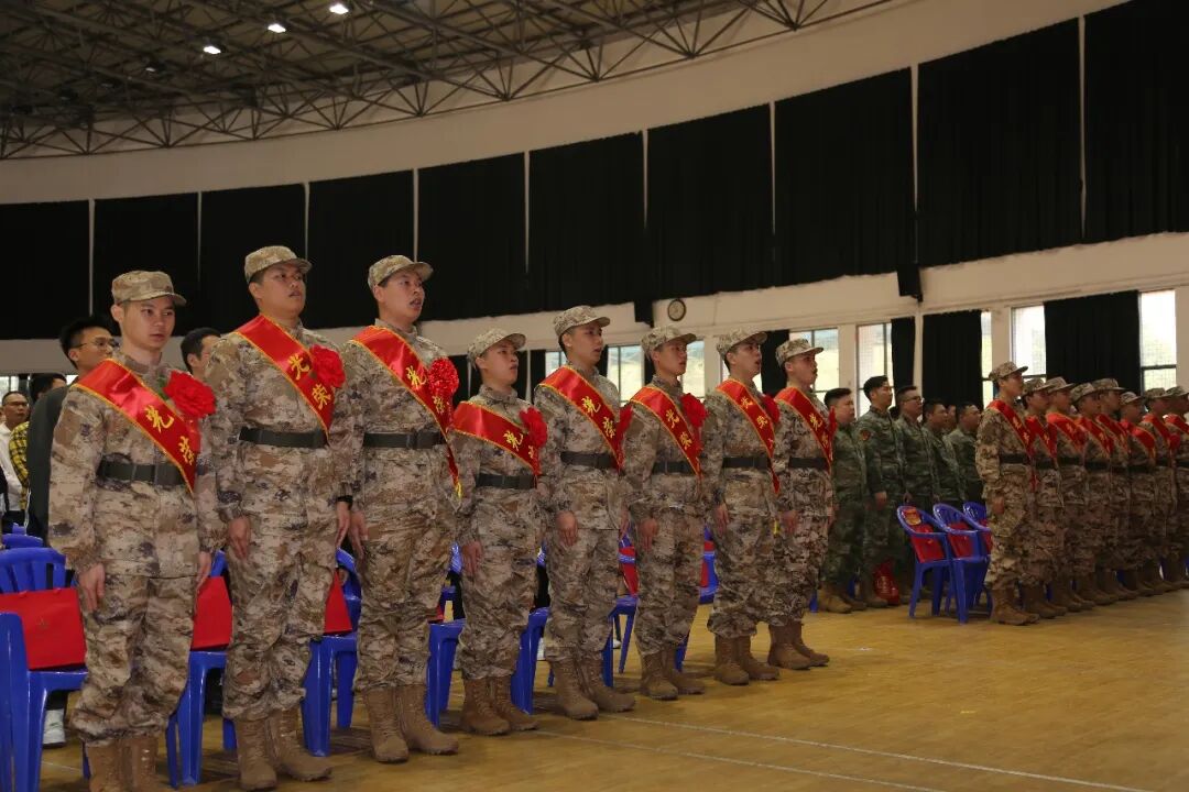 会场内,气氛庄重而热烈。新兵们身着崭新军装,肩披“光荣入伍”红绶带,胸戴大红花,精神抖擞、意气风发。