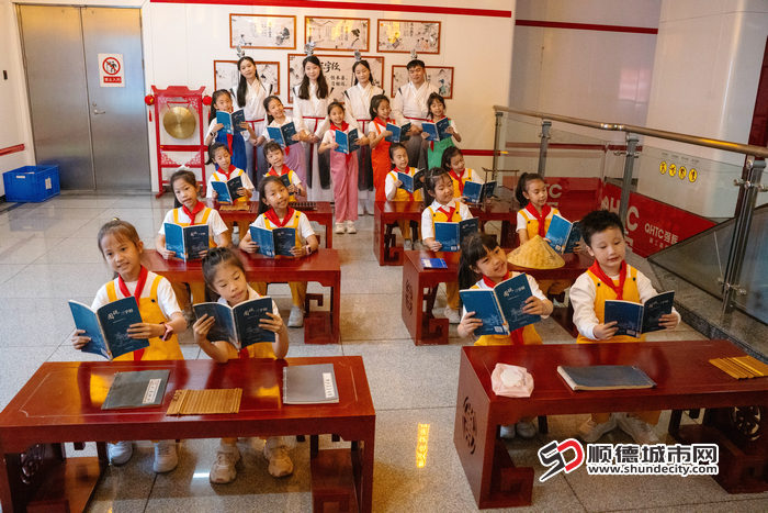 活动当天,登洲站厅被精心打造成古色古香的国学私塾,木课桌、竹简书、线装书等传统教具一应俱全,墙上“人之初,性本善”的墨宝与印着国学箴言的灯笼相映成趣,古意盎然的布置瞬间拉满研学氛围。身着统一黄马甲的小萌娃们端坐桌前,在老师的带领下摇头晃脑诵读经典,奶声奶气的童音在站厅里回荡,与现代地铁的便捷高效形成奇妙呼应,引得过往乘客纷纷驻足聆听、拍照记录。