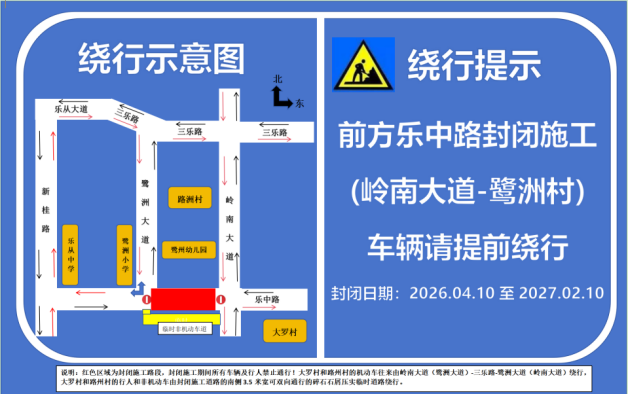 乐中路(岭南大道-路州入村大道段)因道路提升需要,将于2026年4月9日21:00开始进行全封闭施工,施工期间禁止所有车辆通行。