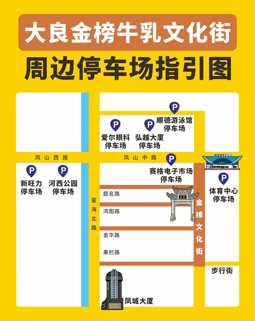 同时,我们已在鉴海北路和凤山中路沿路设置了5个醒目的指示牌,您只需跟随指引,即可轻松达到周边停车场。
