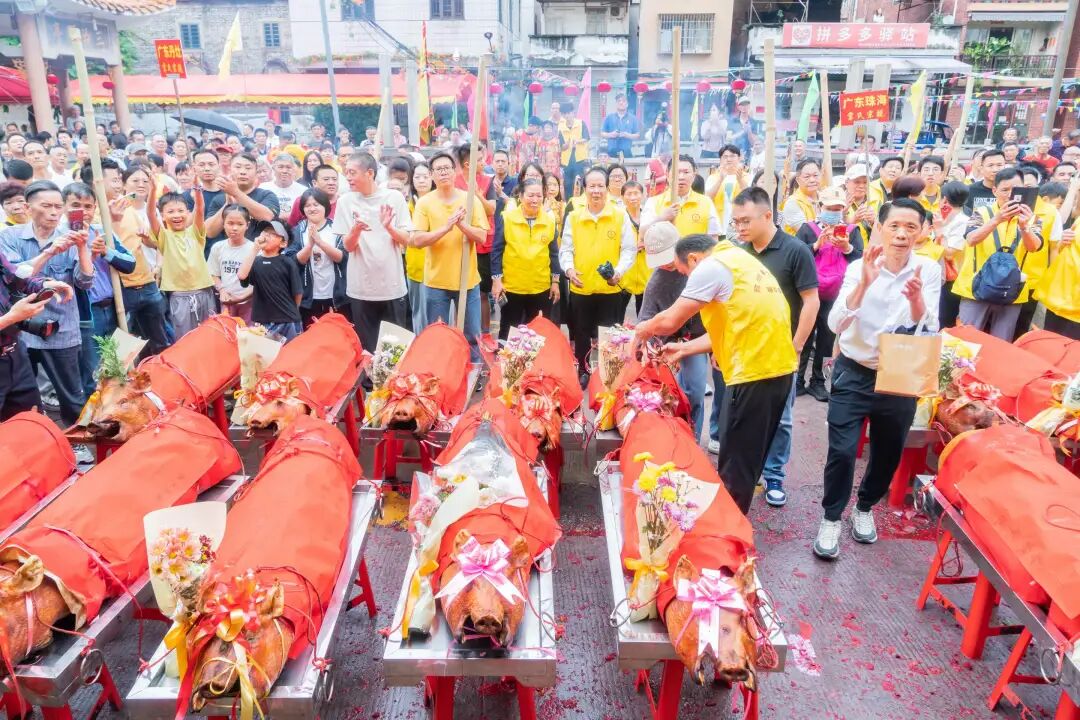 在烧猪分发仪式上,烧猪被切成多份,长者优先领取,孩童围坐嬉戏,呈现出一派和乐融融的景象。韦应恒感慨道:“太公分猪肉不仅是传统,更是尊老爱幼、团结互助的家风传承。”